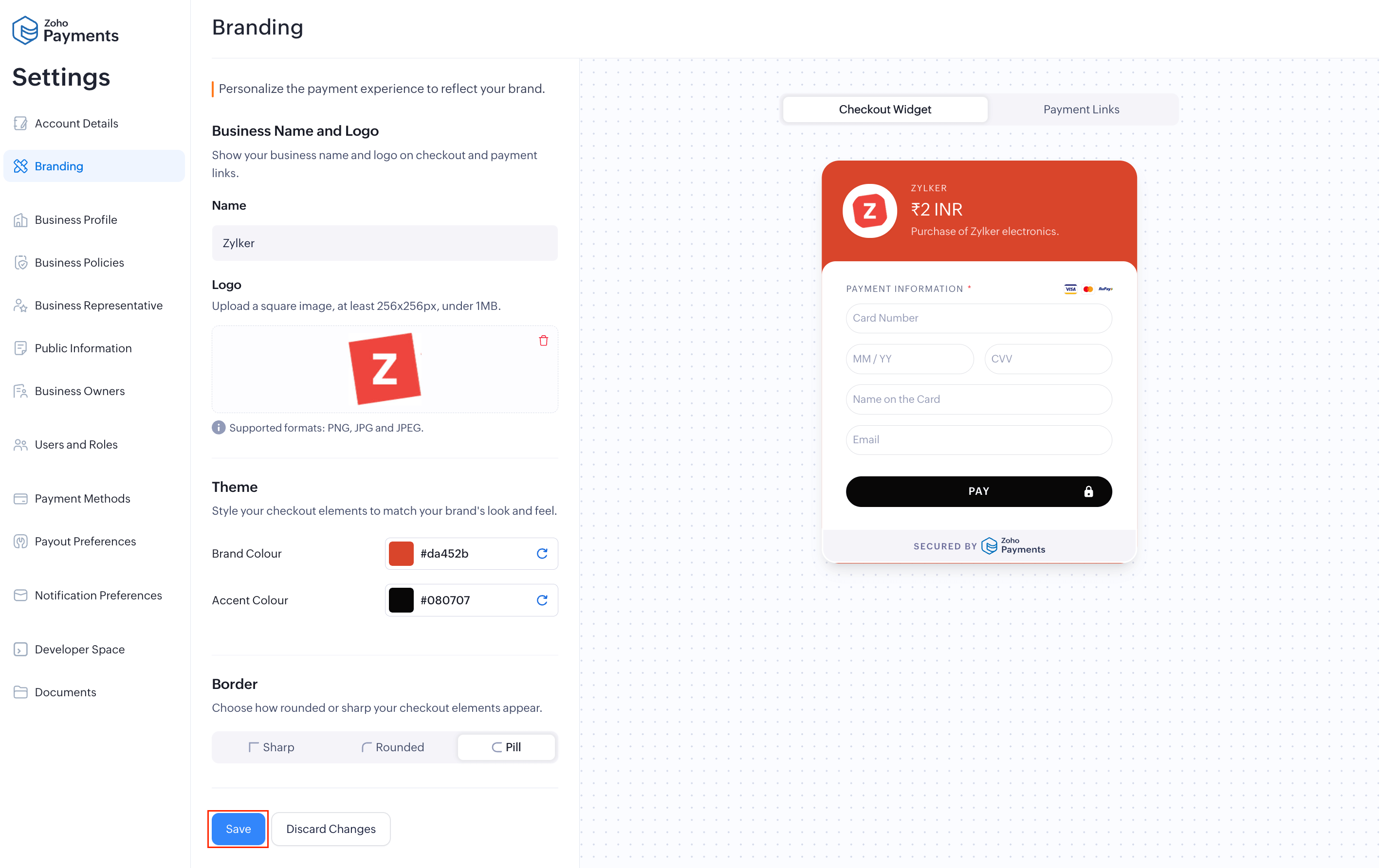 Zoho Payments allows you to reflect your brand’s identity during every transaction by customizing your name, logo, and colours displayed on the checkout widget and payment links. This provides a professional payment experience, enhances your brand visibility, and reassures customers that they are making the payment to the right business.