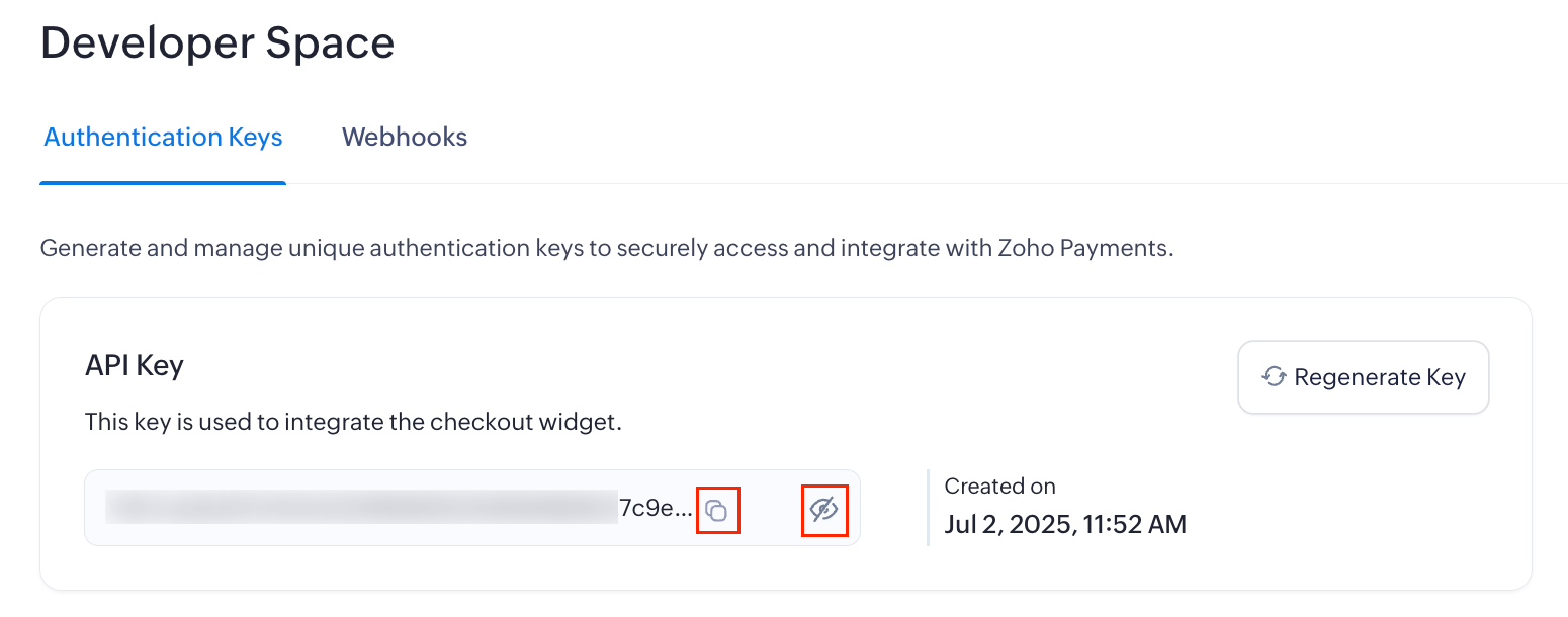 Your API key will be generated, and you can use this to authenticate your checkout widget. You can view the key by clicking the Eye icon, and copy it by clicking the Copy icon next to it.