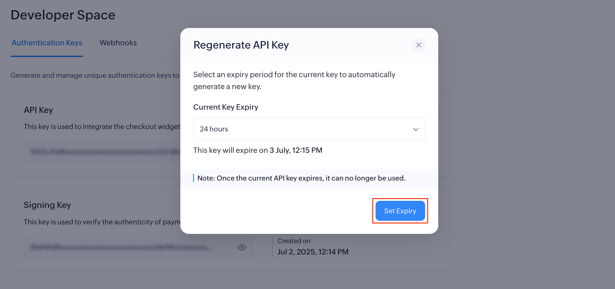 Note: If you select Now as the expiry, the current key will be immediately replaced by the new one. However, if you select any other expiry, you can use the current and the regenerated key.