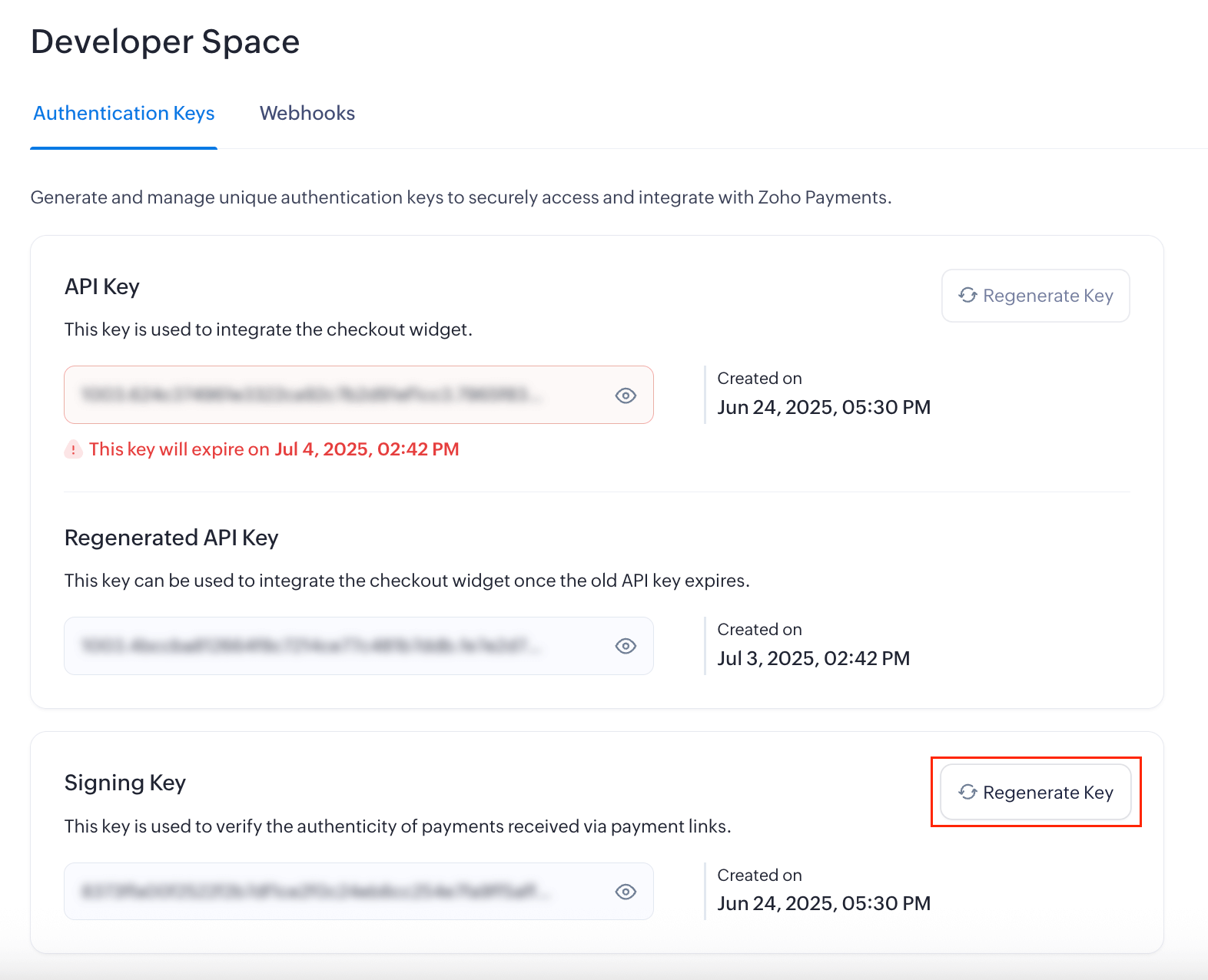 Zoho Payments supports two types of authentication keys: API Key and Signing Key.
