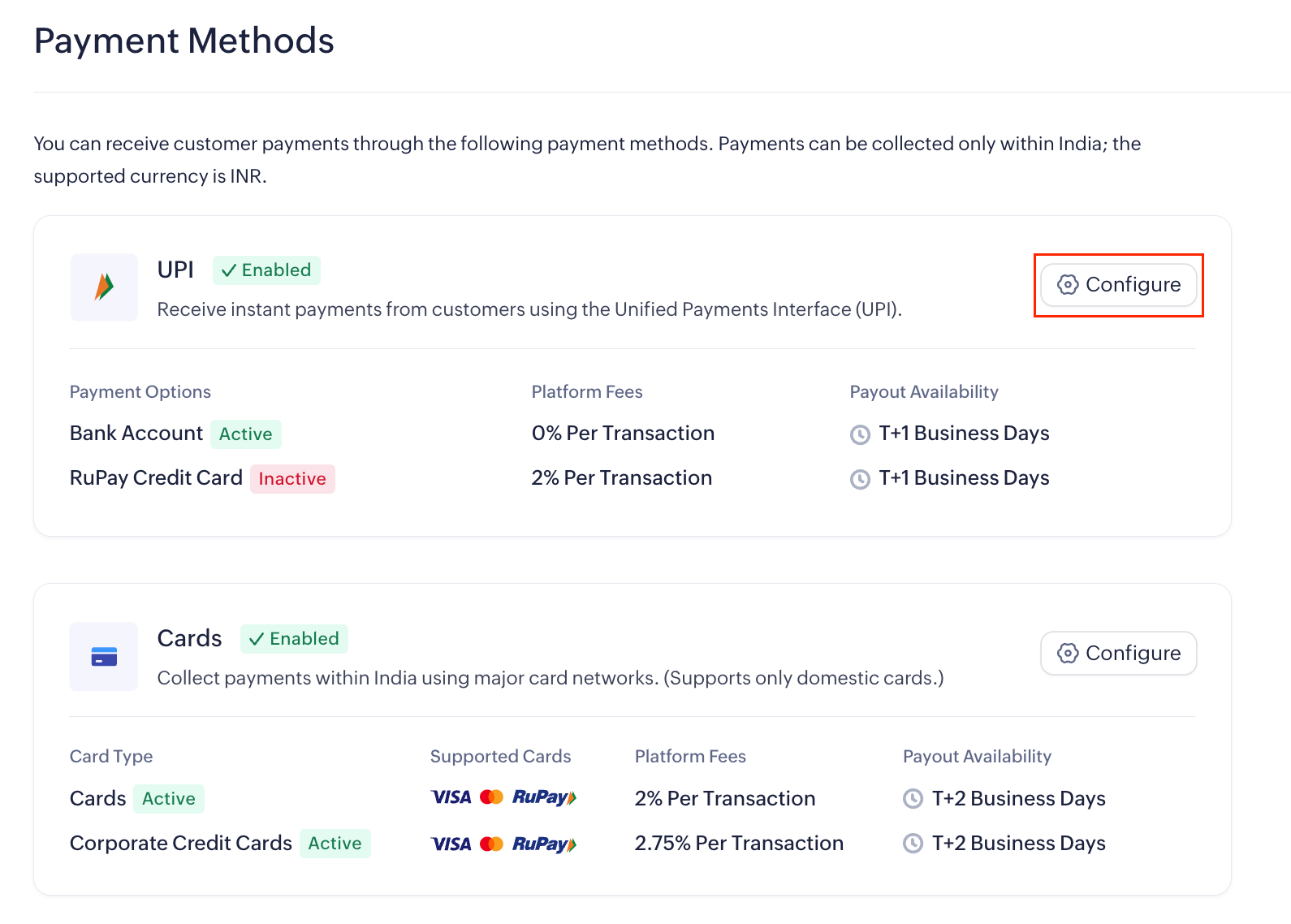 Note: To accept UPI payments via RuPay credit cards, you’ll have to enable it manually under Cards > Configure > Enable RuPay Credit Cards.