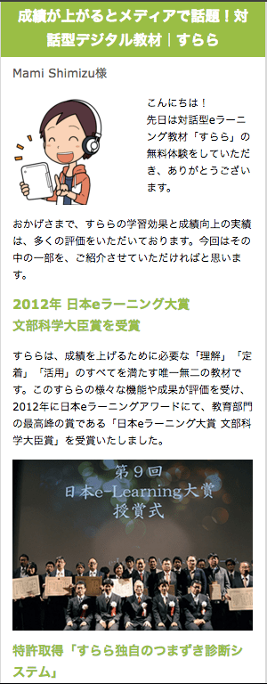 HTMLメールに対応し、画像を取り入れられるのもありがたい。 BtoC(E/U)向けには、教材にも共通するような楽しい雰囲気をメールで伝えられる。