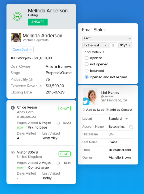 • 営業部門は、一連のアクションを進める上で、見込み客へ電話するのに最適な時間や商談の受注見込みなどをリアルタイムに把握できます。「Zia」はマーケティング活動と営業活動を分析し、受注機会を予測します。 また、「Zia」は実際のビジネスの健全性に対する傾向を監視し、異常を予測します。これにより、各部門は潜在的な問題を事前に対処できます。「Ask Zia」機能を使用して、簡単な音声コマンドやテキストメッセージで、過去、現在、そして未来の顧客情報にアクセスできます。