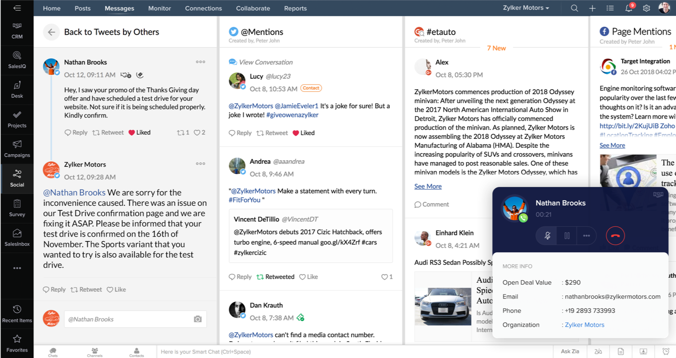 • Zoho Social 、SalesIQ、Desk、CRM、Survey のシームレスな連携により、顧客との対話を単一のやりとり上で文脈に応じて実行し、顧客対応部門全体で簡単に共有できます。