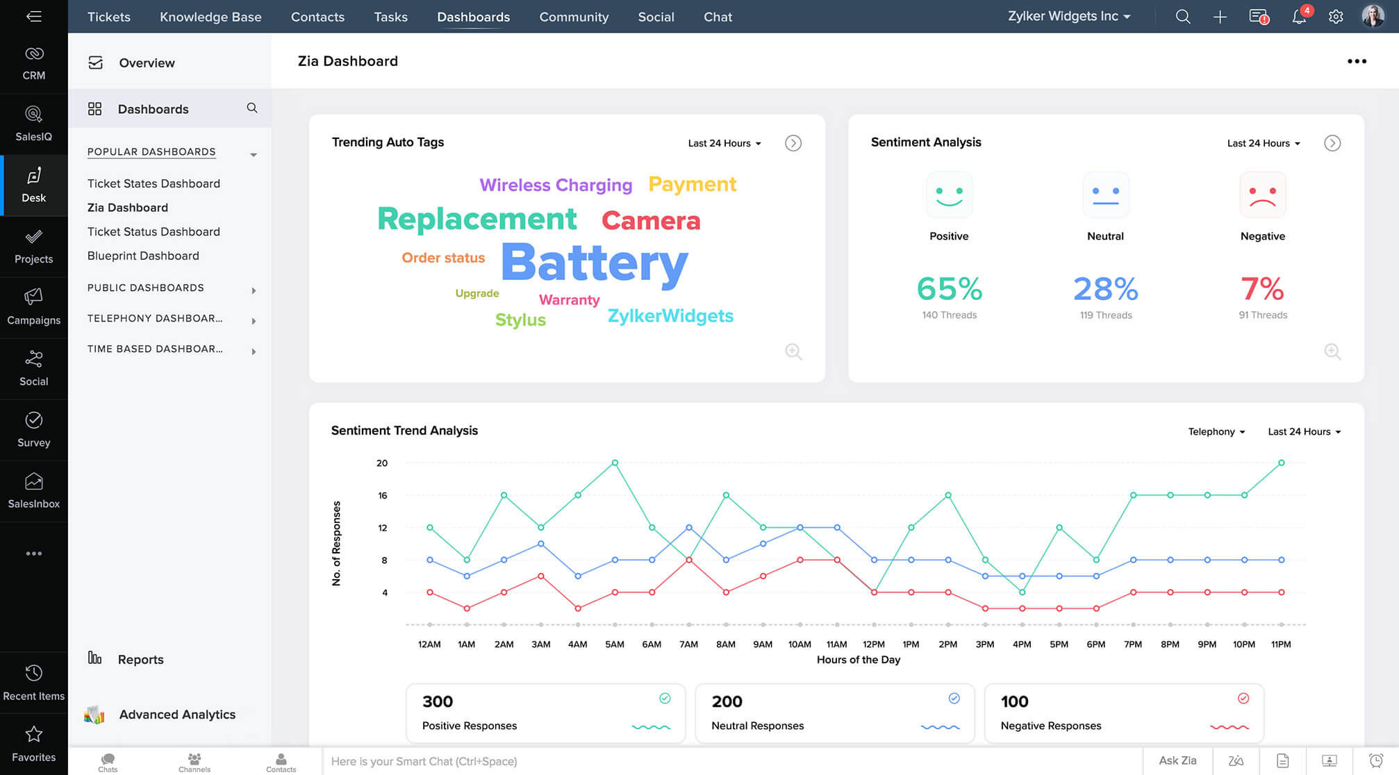 • Zoho Desk、CRM、SalesIQ、「Zia」の機能により、企業は顧客が抱える問題に対して適切なタイミングで適切な解決策を提供できます。同時に、営業やサポート担当者の生産性向上と情報提供にも役立ちます。