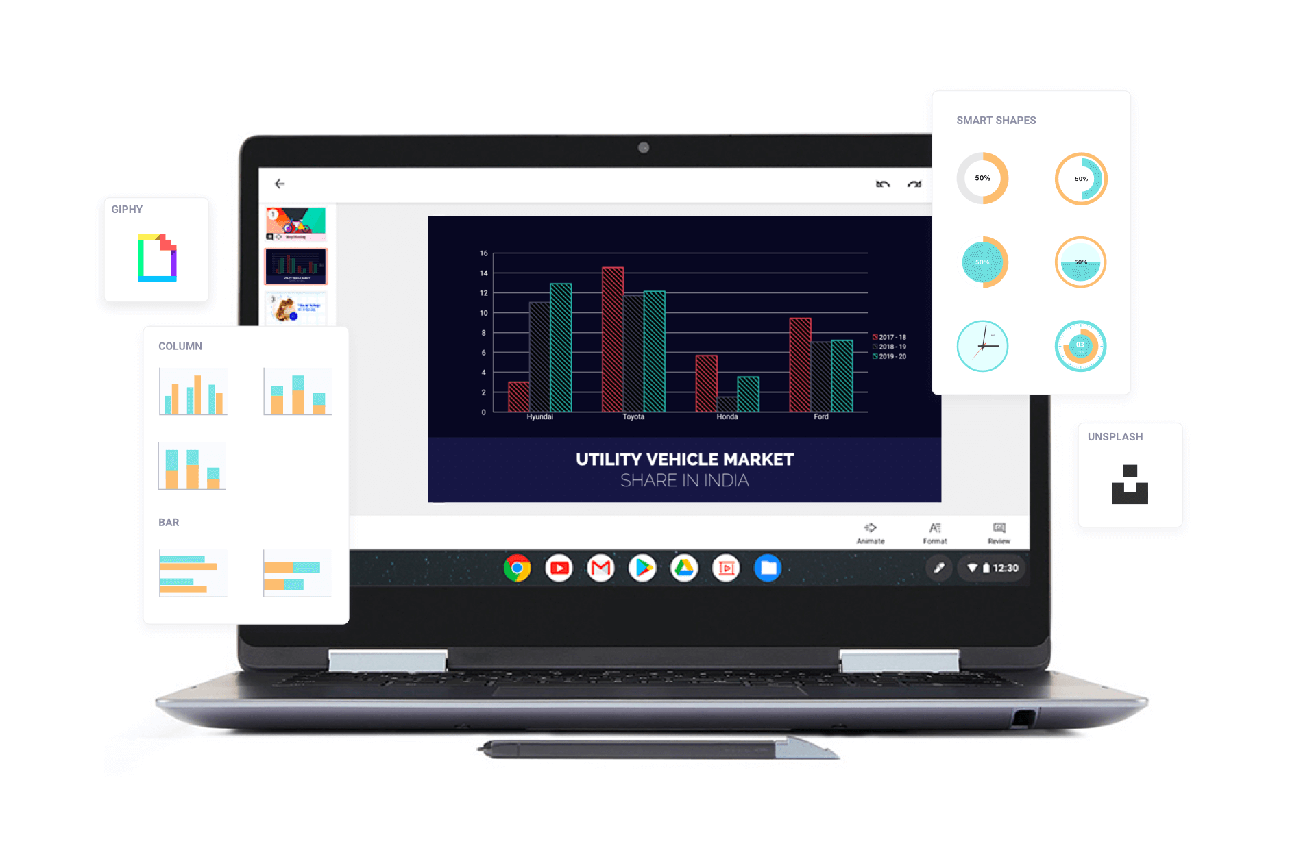 チャート、スマート要素、画像、GIFなどの機能を使用して、印象的なスライドを作成できます。ShowではUnsplashやGiphyに無料でアクセスできます。データを鮮やかに提示して、忘れられない感動を演出しましょう。
