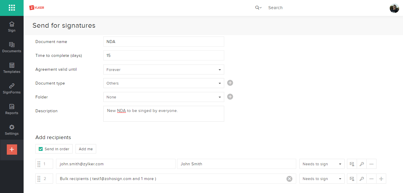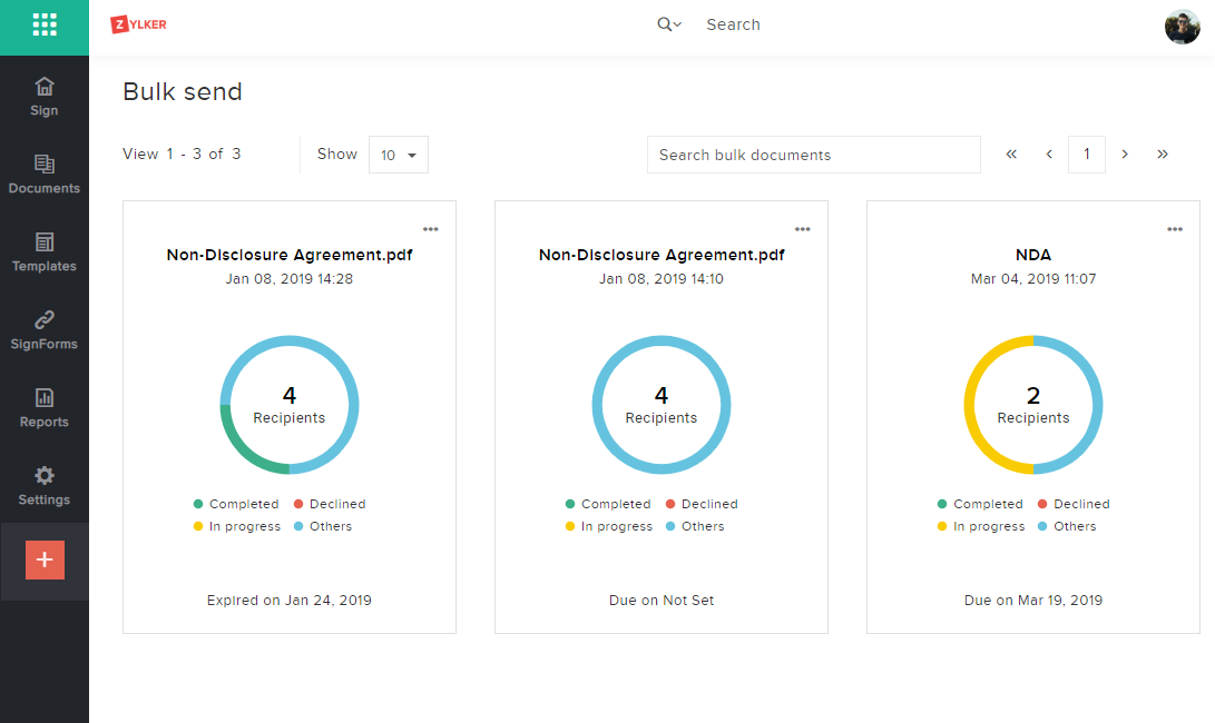 署名を集めるために文書をいくつかのグループに送信していませんか? Zoho Sign の一括送信機能は、そうしたお客さまの日常業務を簡略化します。