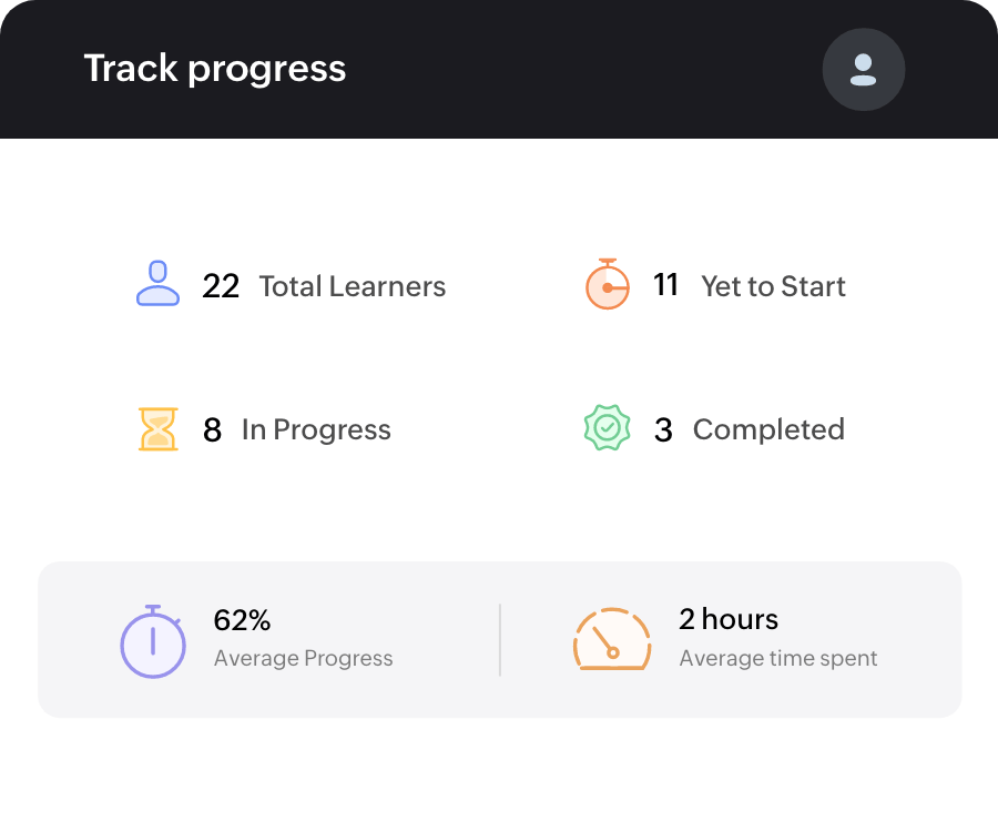 Gain valuable insights into individual learner performance and course engagement through Zoho Learn’s real-time reporting and analytics. Track progress and access detailed user reports to identify areas for improvement and tailor your training to effectively bridge any gaps in learning.