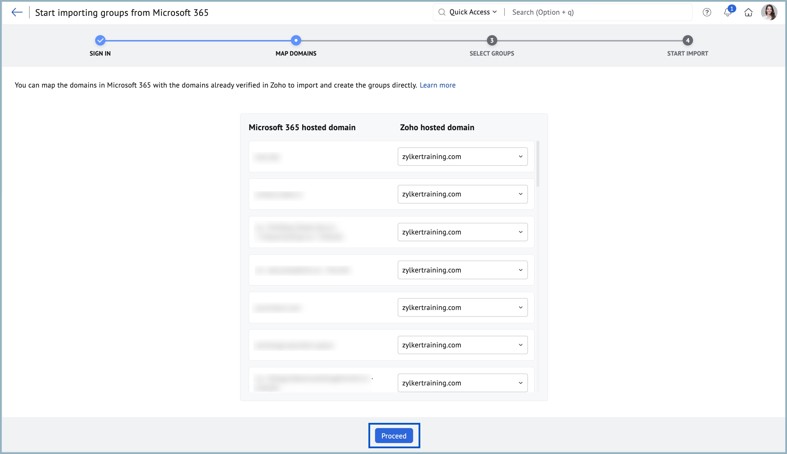 - Map the domains in Microsoft 365 hosted domain to the verified domains in Zoho Mail and click Proceed. All the groups created with the verified domain will be listed here.