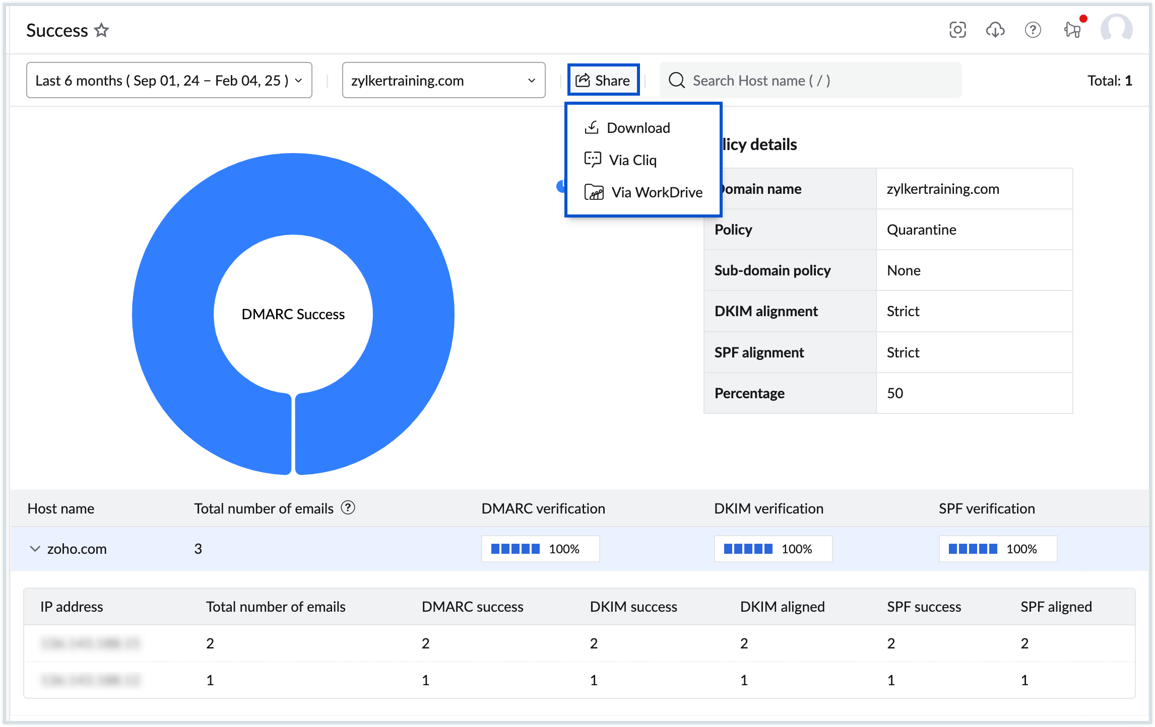 - DMARC success - The total number of emails that passed DMARC verification among the total number of emails sent from that specific IP address.
