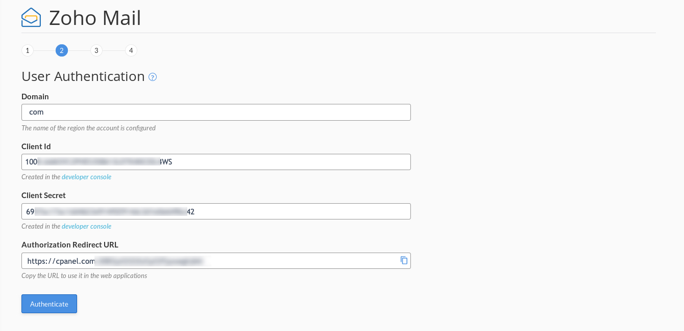 In this step, you need to authorize your Zoho Mail account in the User Authentication page.