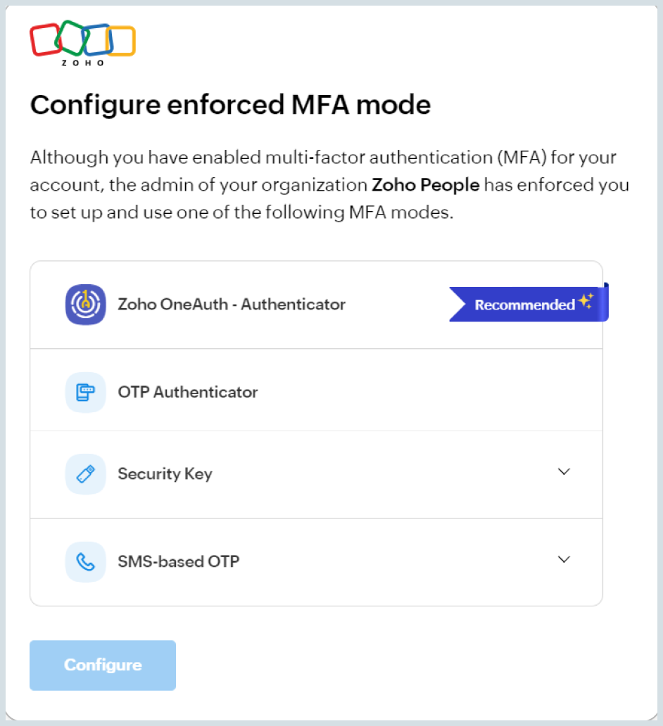 Once MFA is enabled, all your future sign-ins will require authentication to avoid unauthorized access. If you are part of an organization, your organization admin will enforce you to set up a MFA mode if MFA is configured. If not you can configure any of the MFA modes from your Zoho accounts page.