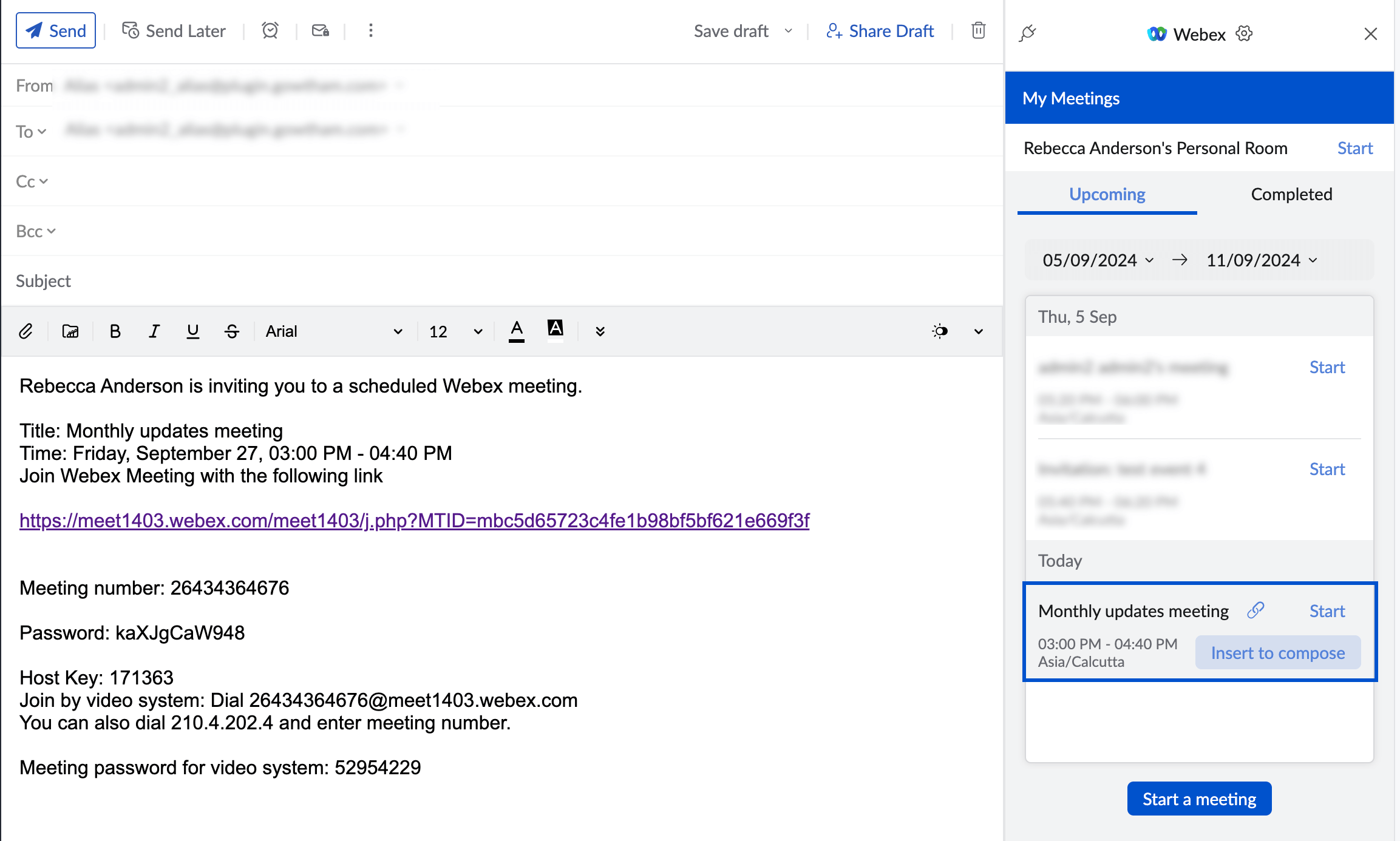 In your list of upcoming meetings, you can use the Insert to compose option to add meeting details to your email draft or you can also copy the meeting link. To launch the meeting directly, click the Start icon.