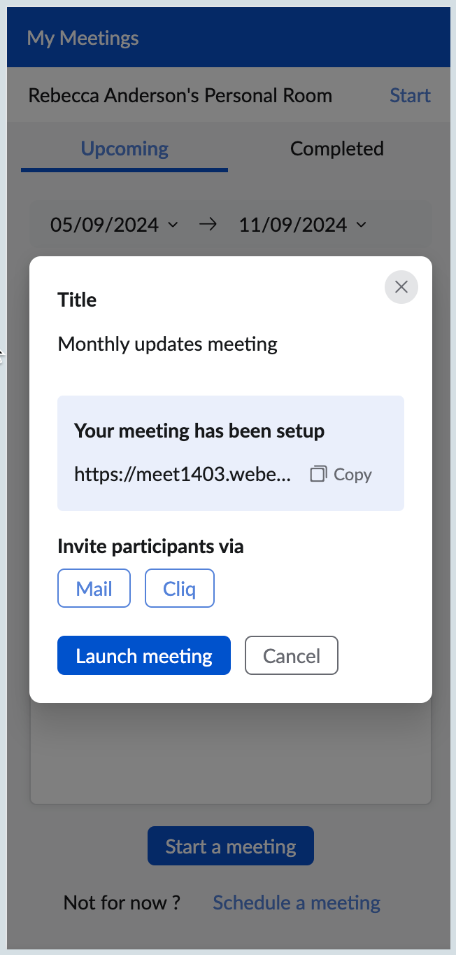 A pop-up window will appear displaying meeting title, meeting link and options to invite participants via Cliq or Mail.