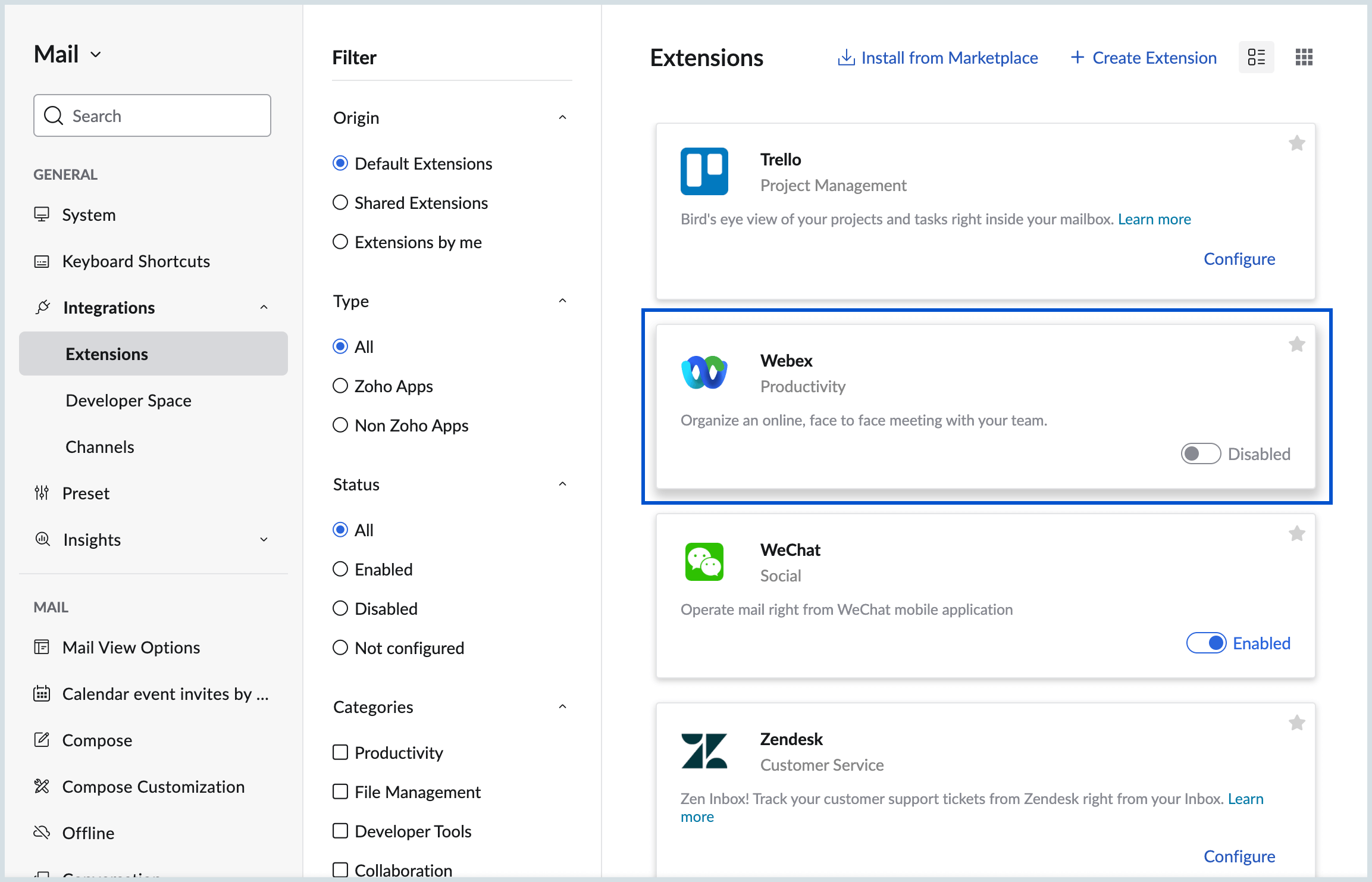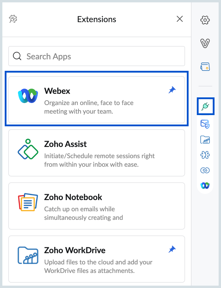 Webex extension in Zoho Mail allows you to schedule meetings, view all you upcoming and completed meetings, invite users to your personal room to start a meeting without having to leave your mailbox.