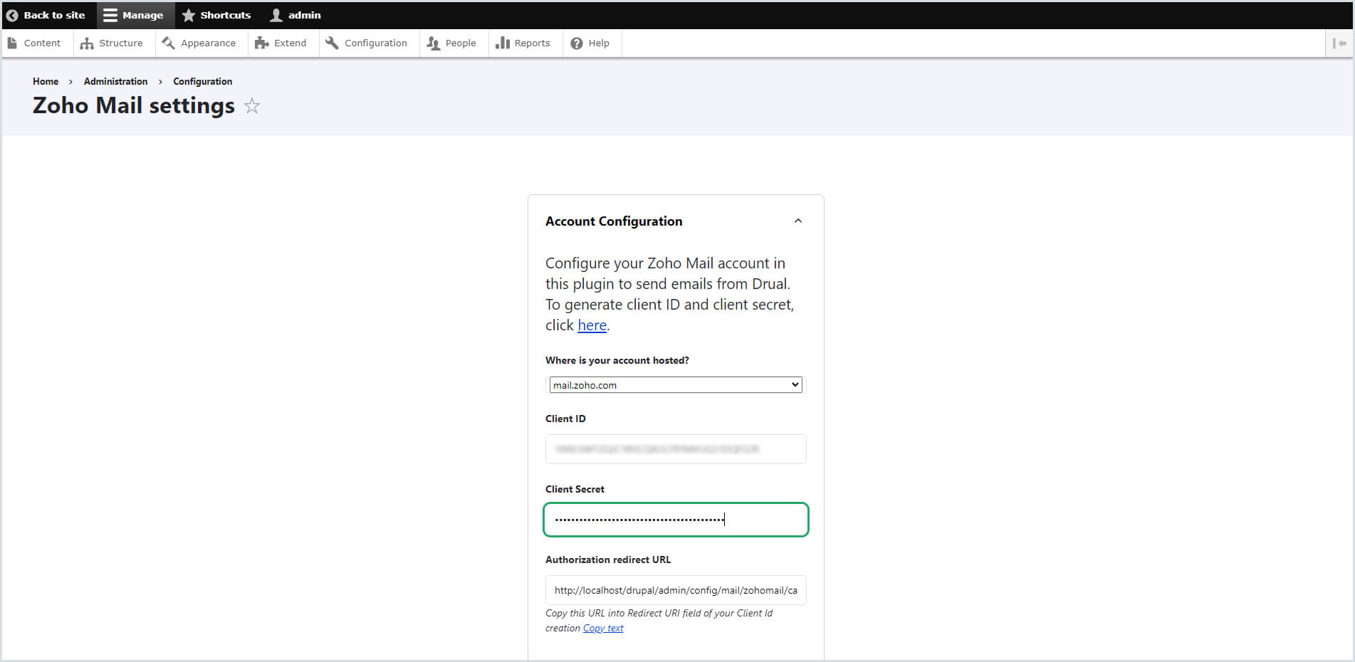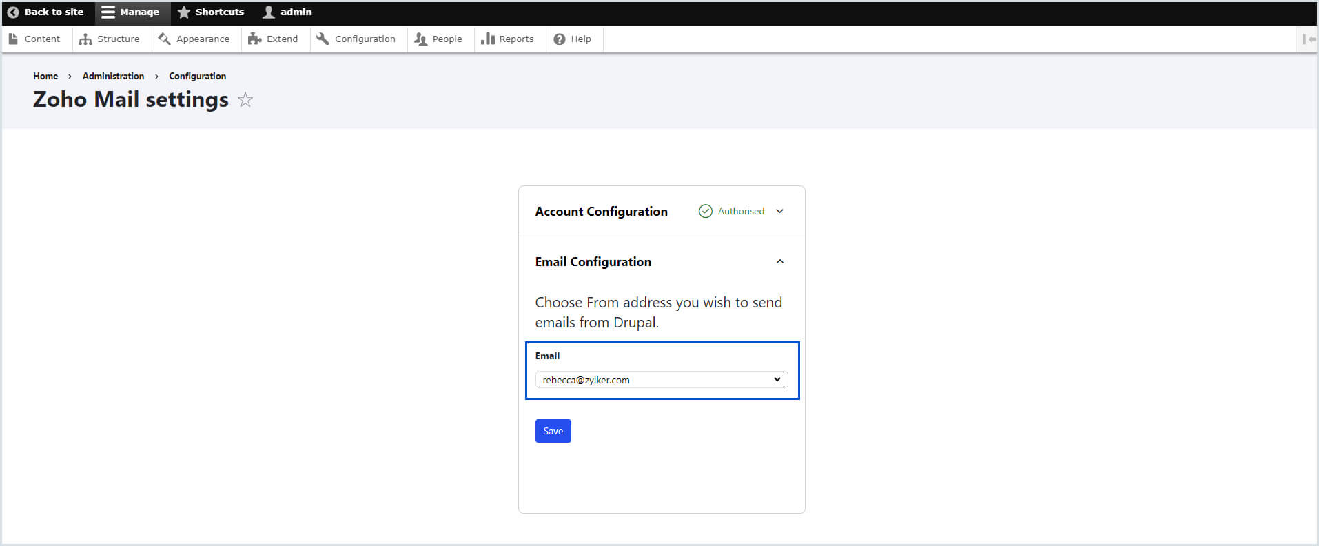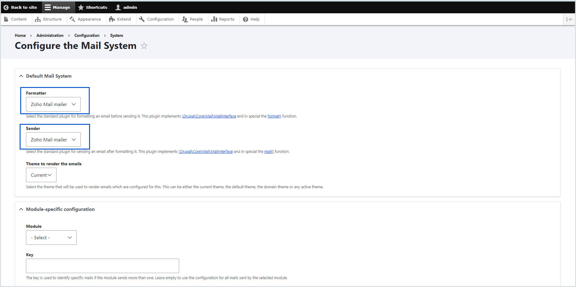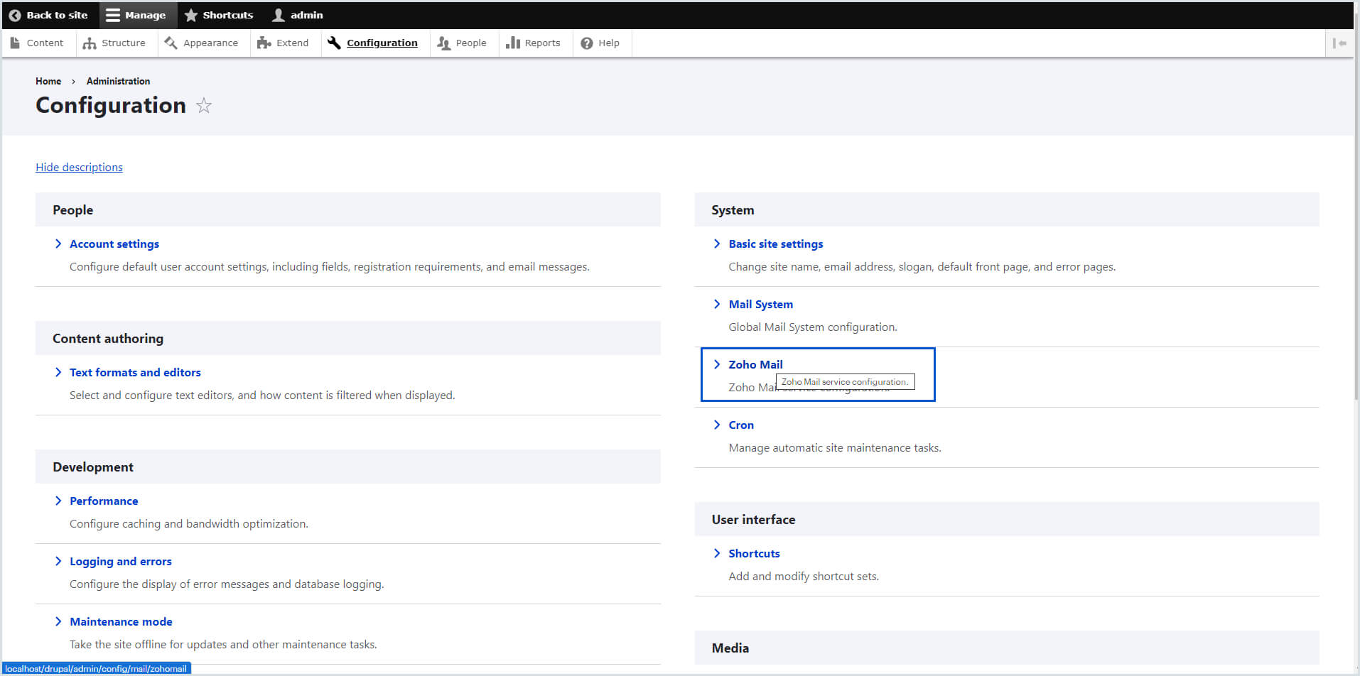 10. Navigate to the Zoho Mail configuration page in Drupal CMS Admin Account.