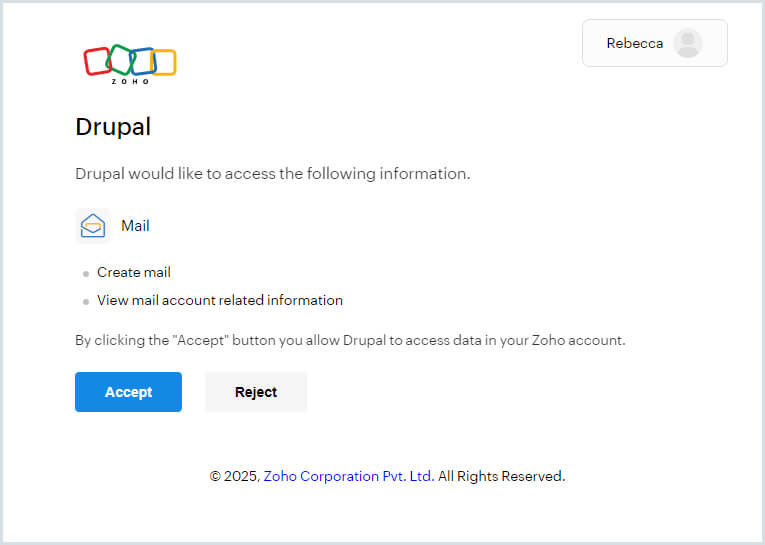 13. You will be taken to the Zoho Mail account authorization window. Enter your email account credentials and click Accept.