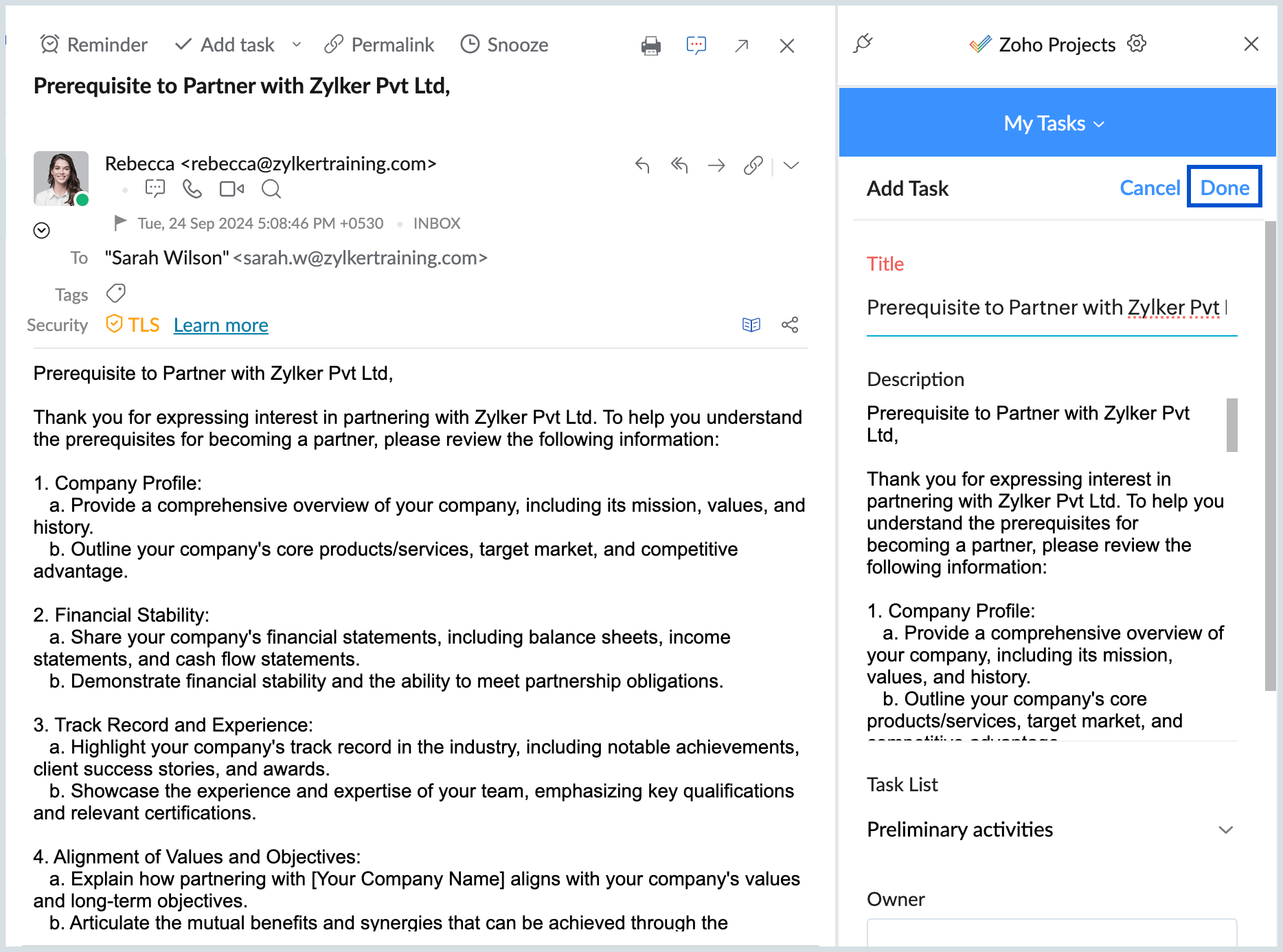 Zoho Projects Preview in Mail