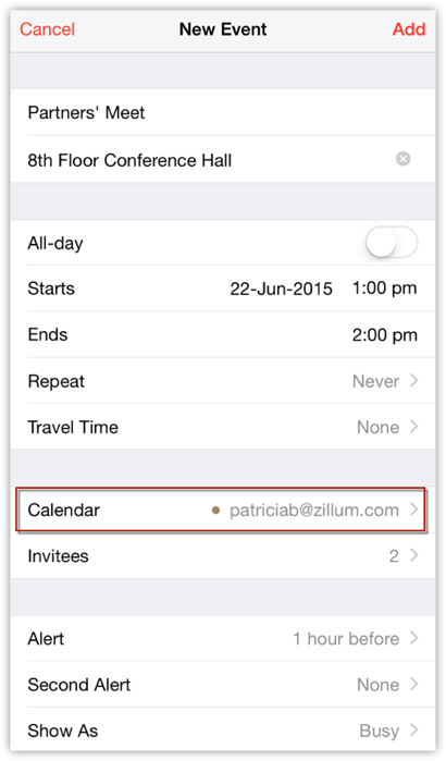 Nadat u CalDAV-toegang hebt ingeschakeld in Zoho CRM en het CalDAV-account hebt geconfigureerd op uw iOS-apparaat, worden de afspraken die u maakt in de Zoho CRM-agenda gesynchroniseerd met de iOS-agenda en vice versa. Nadat de afspraken op de twee agenda's zijn gesynchroniseerd, kunt u ook herinneringen voor afspraken ontvangen in Zoho CRM en op de iOS-apparaten waarop het CalDAV-account is geconfigureerd, in overeenstemming met de instellingen voor herinneringen.