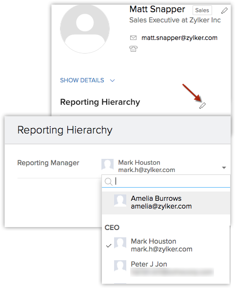 In het bedrijfsleven zijn er talloze situaties waarin goedkeuring van een leidinggevende vereist is voordat een activiteit kan worden afgerond. Met Zoho CRM kunt u dergelijke activiteiten doorsturen naar de leidinggevende van een recordeigenaar. In de rapportagehiërarchie kunt u de reporting manager van de eigenaar van een record kiezen om deze acties uit te voeren. Hieronder staan enkele gevallen waarin een rapportagehiërarchie aanzienlijke wijzigingen met zich meebrengt: