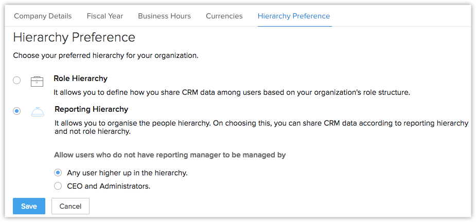 In de rapportagehiërarchie van Zoho CRM kunt u de structuur van de organisatie instellen op basis van uw gebruikersrollen. U kunt ook gebruikers toewijzen aan geschikte reporting managers voor een goed gedefinieerde toegankelijkheid van records. In deze structuur wordt aan een gebruiker een reporting manager toegewezen die gemachtigd is om de gegevens van de gebruiker te bekijken of te openen. Elk lid dat een hogere rol heeft dan de gebruiker kan fungeren als reporting manager. U kunt ook kiezen of de niet-rapporterende leden van uw organisatie worden beheerd door een leidinggevende in een hogere rol of door de beheerder en/of superbeheerder. Deze structuur zorgt voor gecontroleerde toegang tot informatie binnen de organisatie, deels door ervoor te zorgen dat een gebruiker slechts één reporting manager heeft.