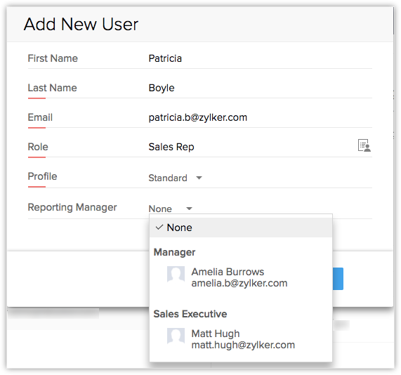 - Selecteer een Reporting manager in de vervolgkeuzelijst. Alle gebruikers boven de geselecteerde rol worden weergegeven.