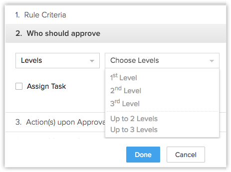 Bij het instellen van Wie moet goedkeuren kunt u niveaus selecteren om te definiëren of de taak moet worden goedgekeurd op het 1e, 2e of 3e niveau van de hiërarchie. U kunt ook kiezen of alle leden tot het 2e of 3e niveau van de hiërarchie goedkeuring moeten geven.