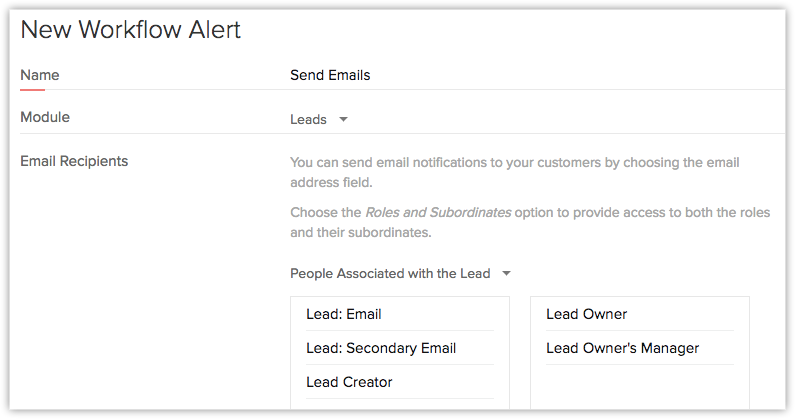 Met Zoho CRM kunt u sets met acties maken waarmee u sales- en marketingactiviteiten kunt automatiseren. U kunt deze acties koppelen aan workflow-regels, Blueprints en goedkeuringsprocessen. Een van de acties die rechtstreeks aan de rapportagehiërarchie kan worden gekoppeld, is het verzenden van waarschuwingen. U kunt een waarschuwing aan een workflow-regel koppelen, zodat de geselecteerde e-mail automatisch naar de ontvangers wordt verzonden wanneer de regel wordt geactiveerd. In de rapportagehiërarchie kunt u de reporting manager van de eigenaar van een record kiezen als een van de e-mailontvangers.