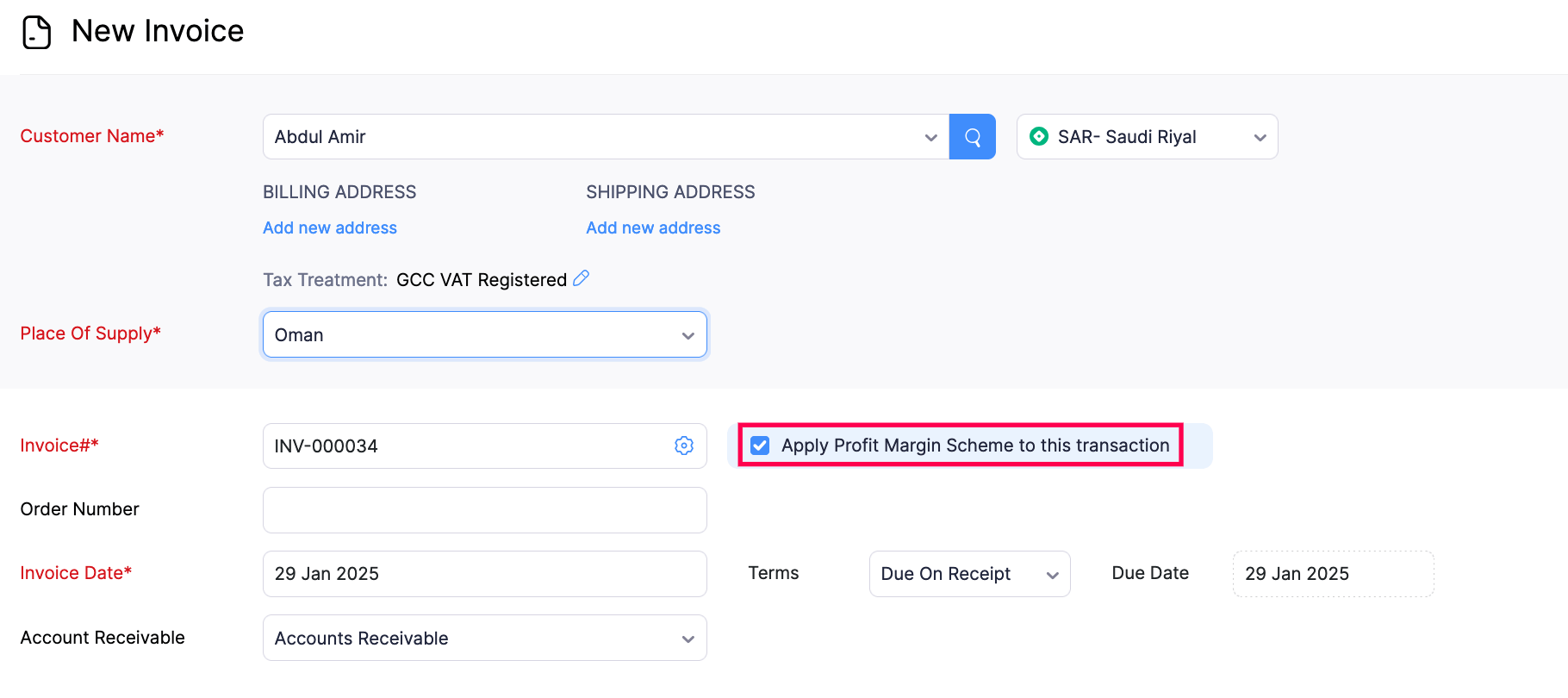 Prerequisite: To create an invoice under the Profit Margin Scheme, you must first create a bill or a self-billed invoice with the required line items.