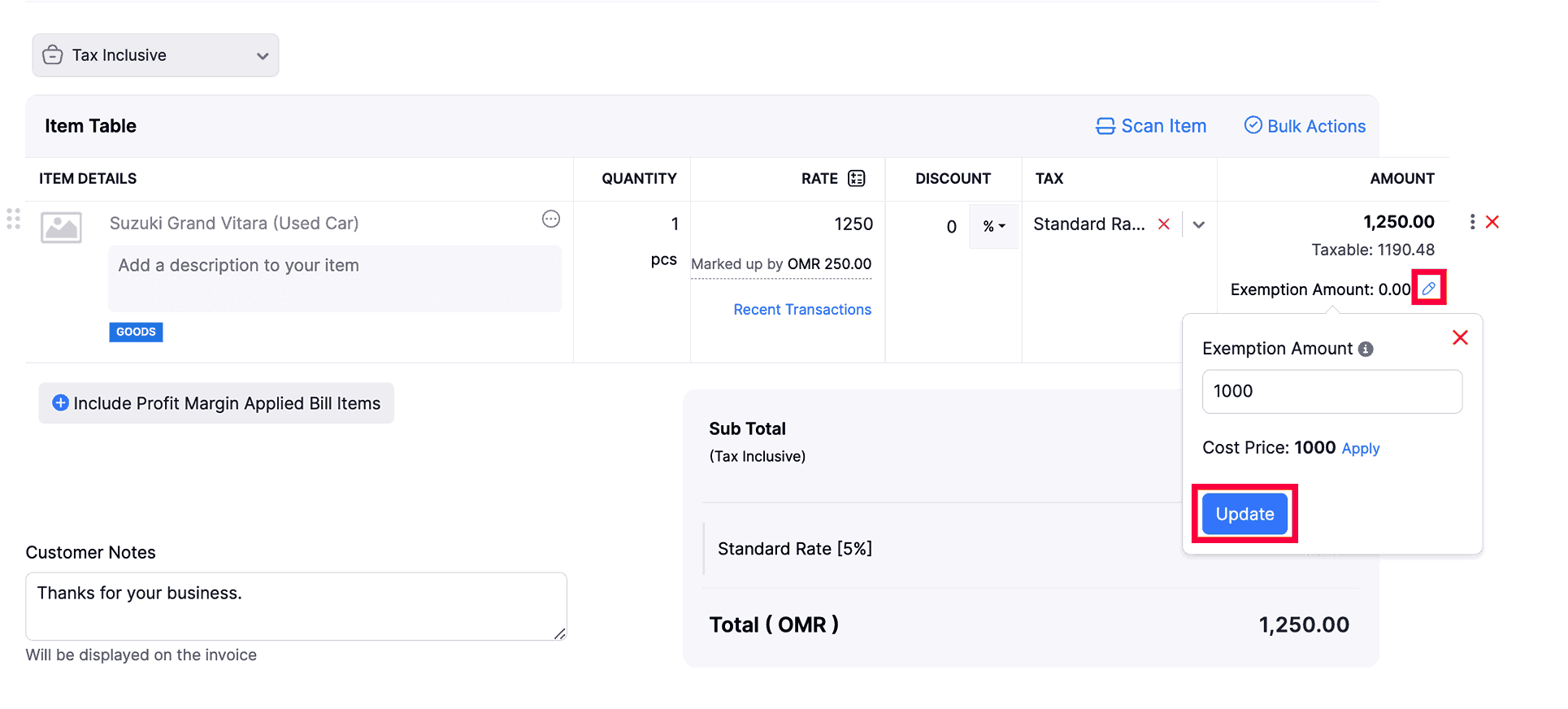 In the Items Table, you can change the values of the line item, if required. If you want to edit the exemption amount of the selected line item: