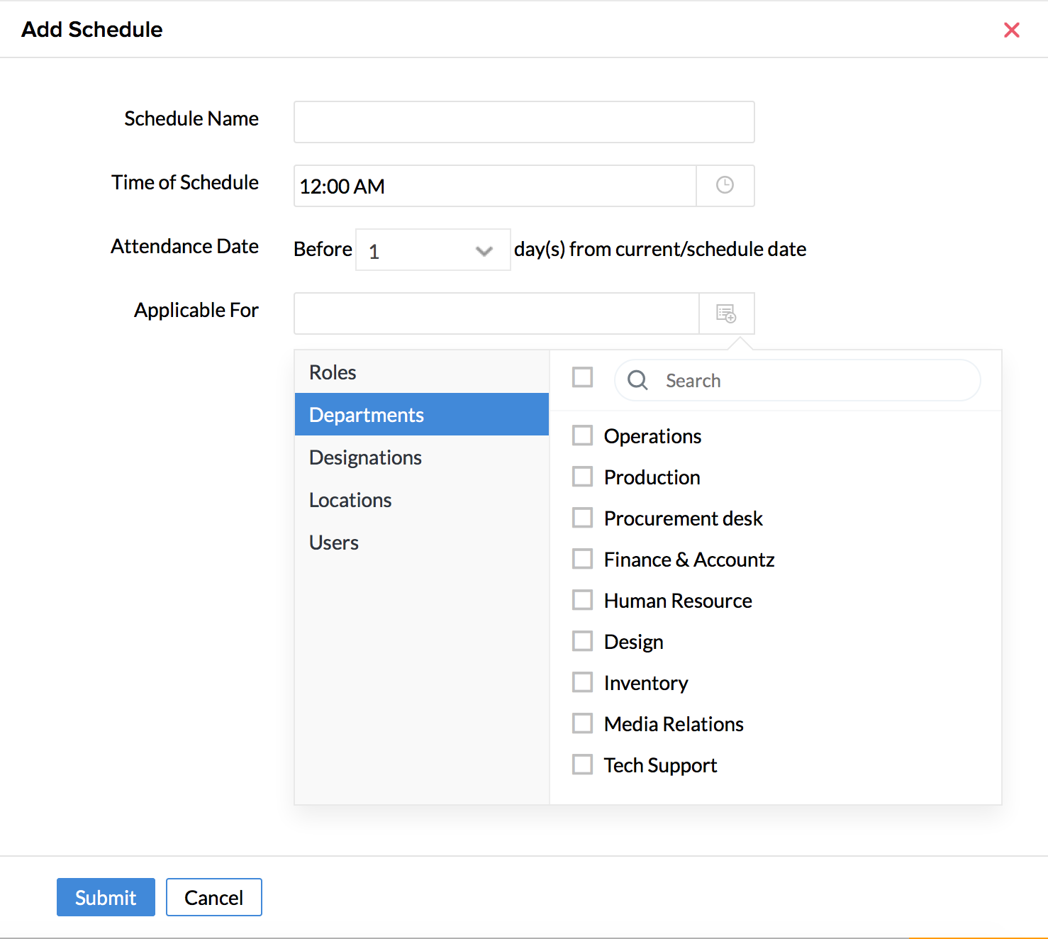 - Under "Applicable For", select the required option from the list of Roles, Departments, Designations, Location, User etc