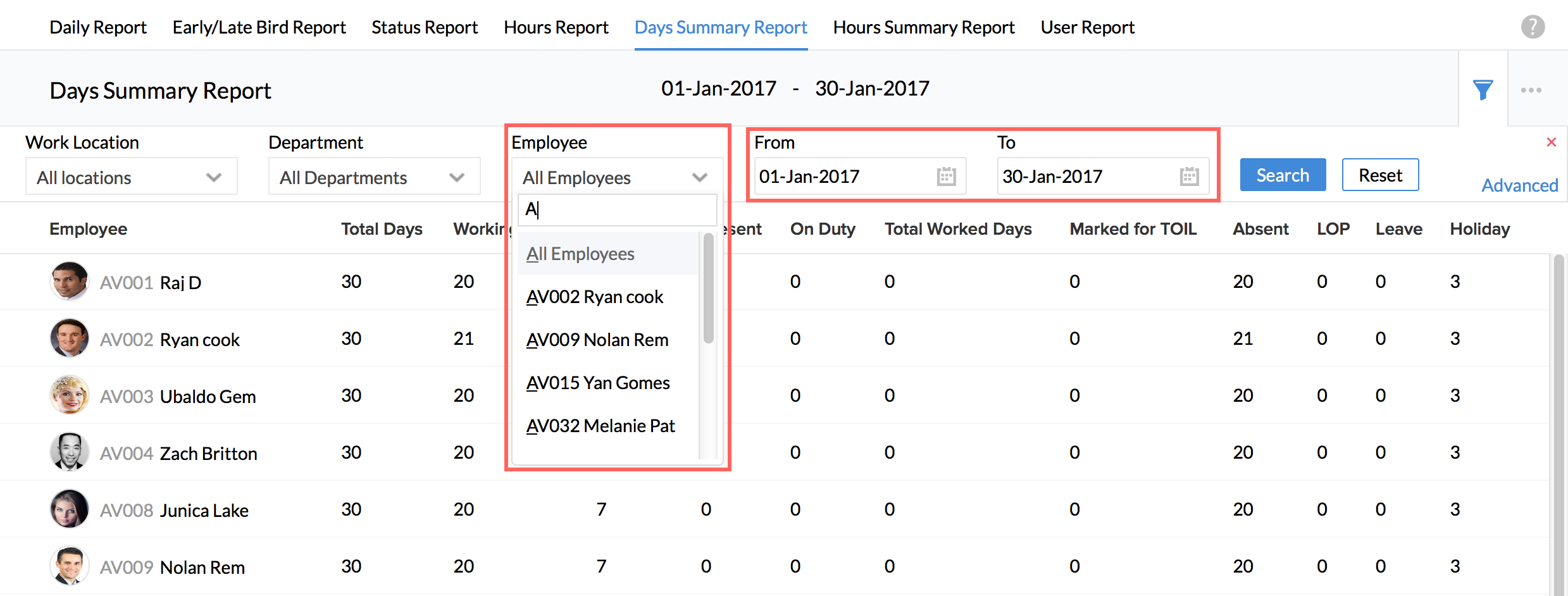 You will be able to see the total number of days worked by the particular employee in the month selected.