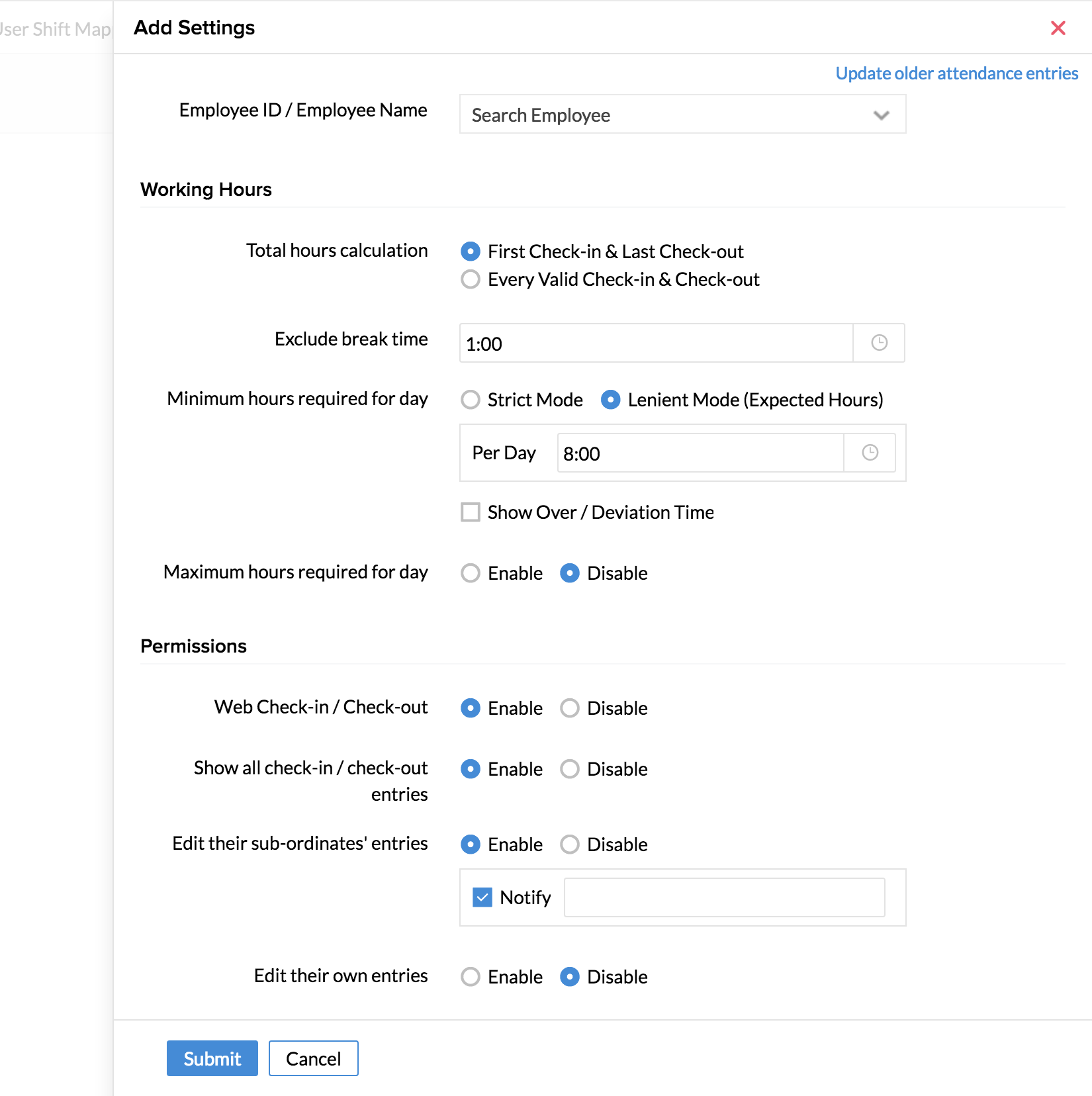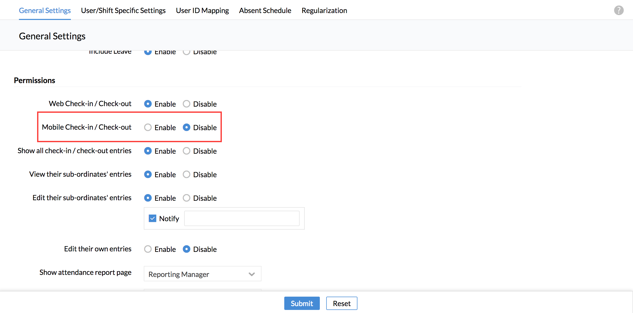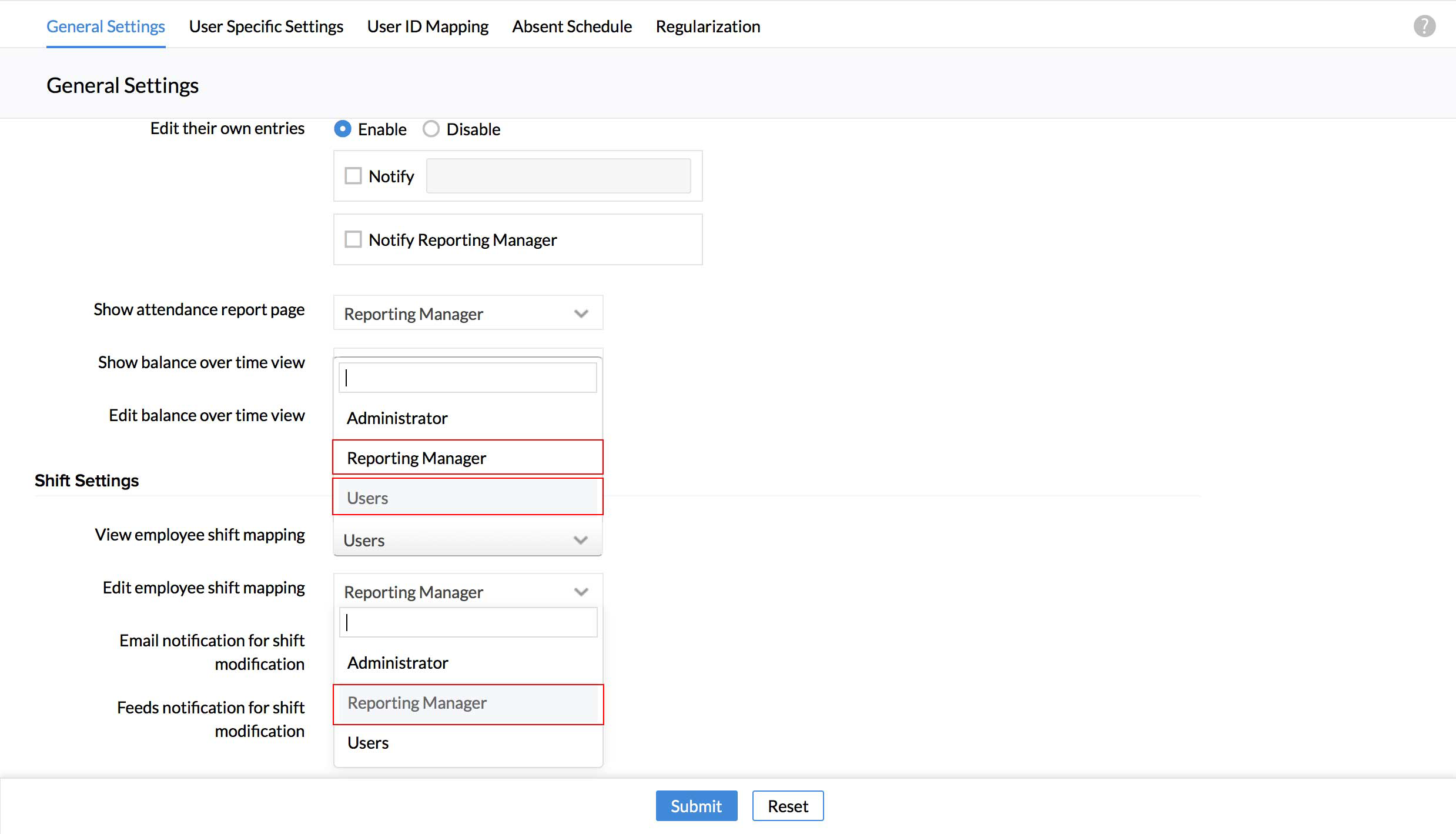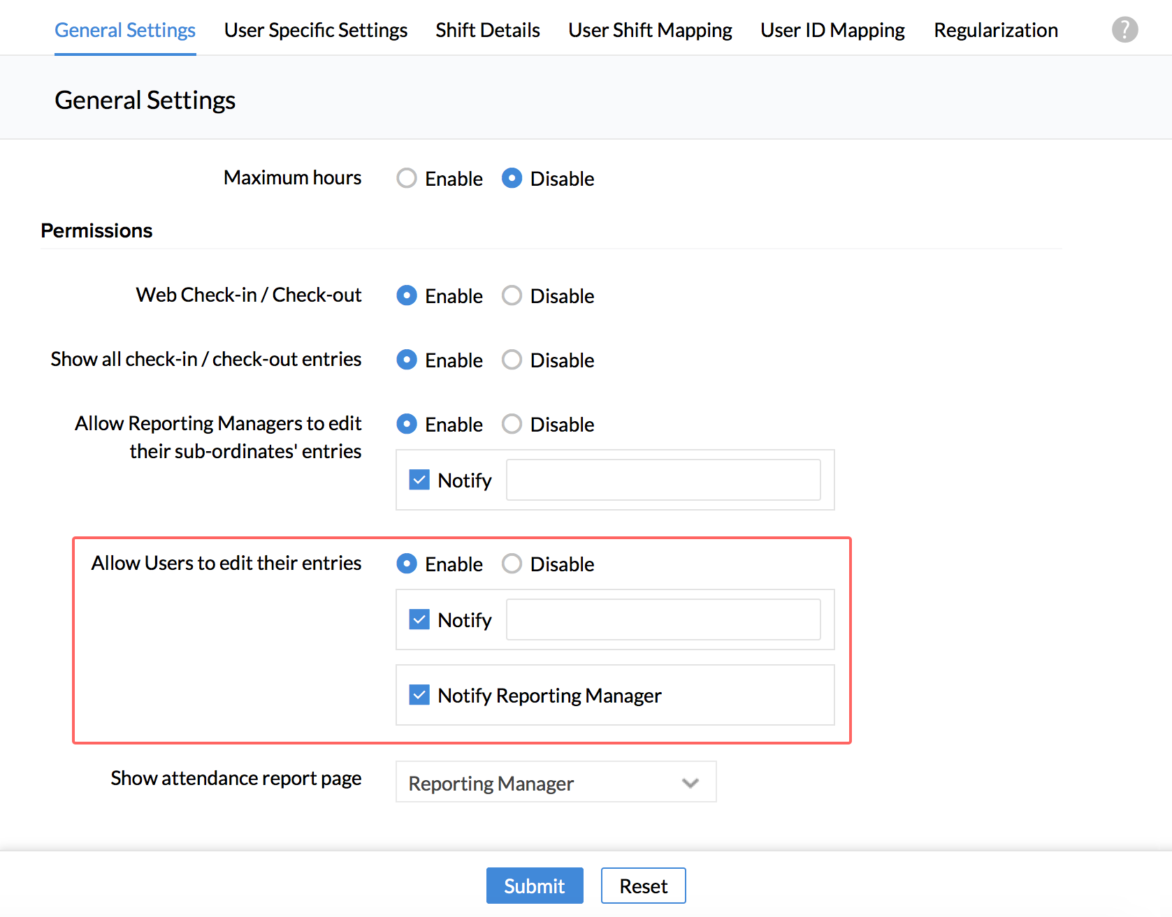 - Go to 'Edit employee Shift mapping' and enable it only for Reporting Manager