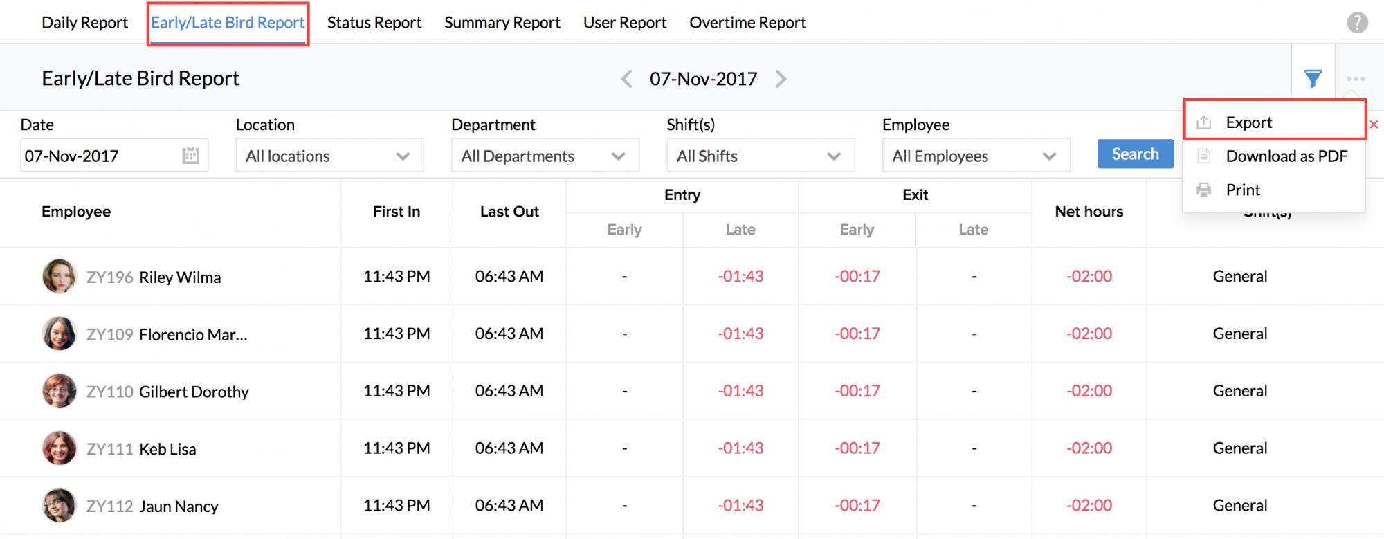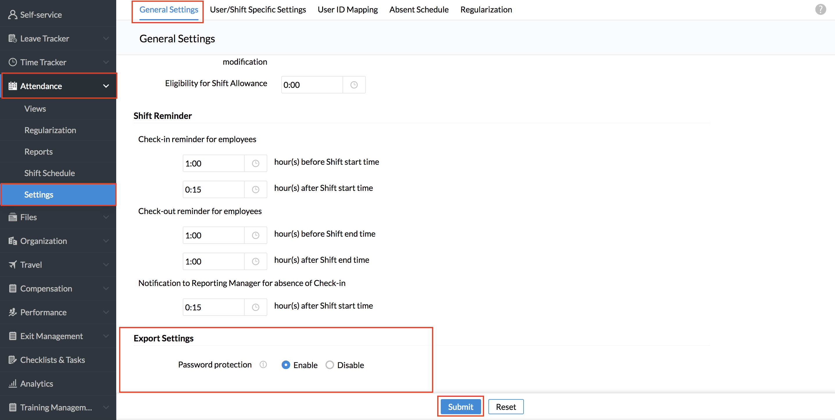 Certain files contain sensitive information that needs to stay private when they get exported. Such attendance files can be encrypted with a password. The file will be accessible only with the password sent to your mail ID. Follow the steps given below to do this.