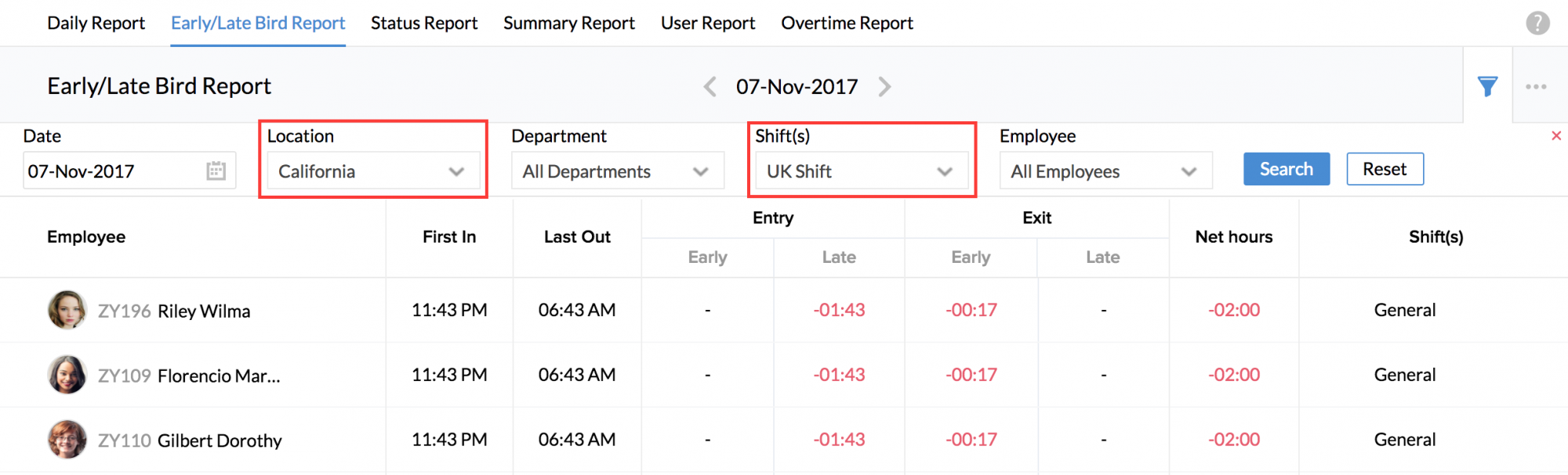 Is it possible to obtain a report on the latecomers of a particular shift of a specific location?