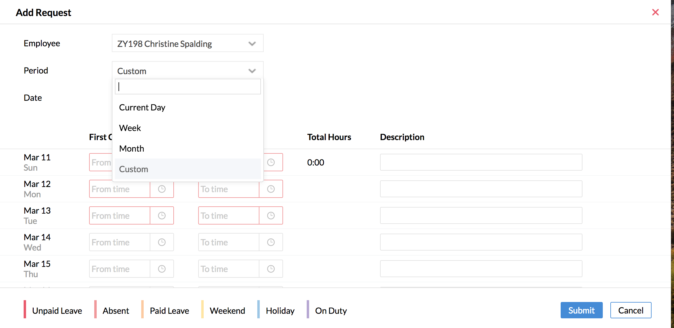 - Under 'Employee' drop down, use the search tab to search for the desired employee
