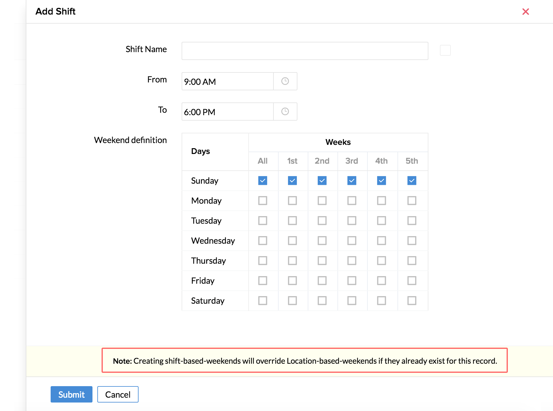 When you add shift you'll find a note at the bottom of the page, "Creating shift-based-weekends will override Location-based-weekends if they already exist for this record."