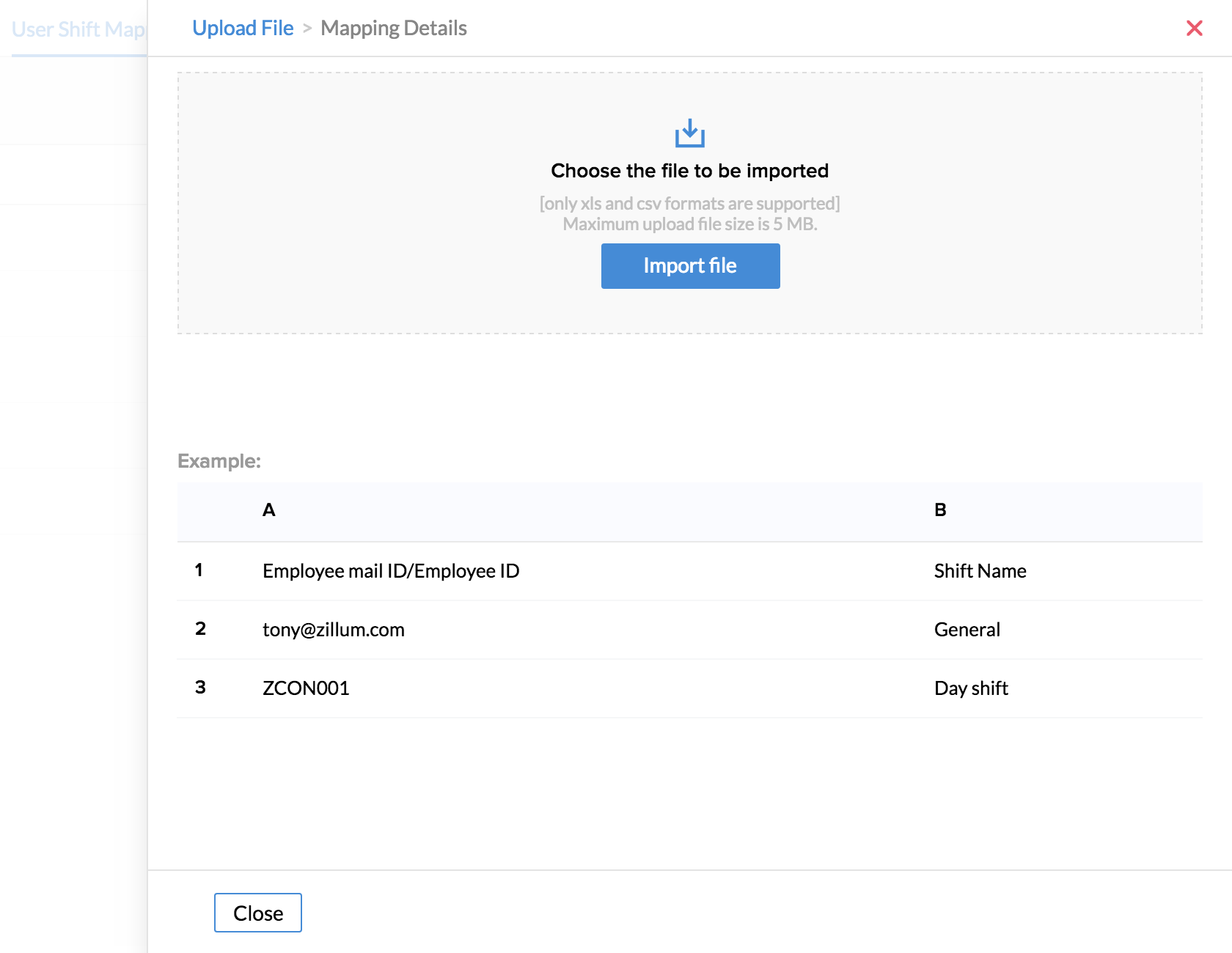 Instead of mapping shift for every individual user, you can use import bulk users and map shifts for users at once. This method is simple and easy to map shifts for a large group of users. Once the import is performed, username gets automatically mapped to the respective shifts.