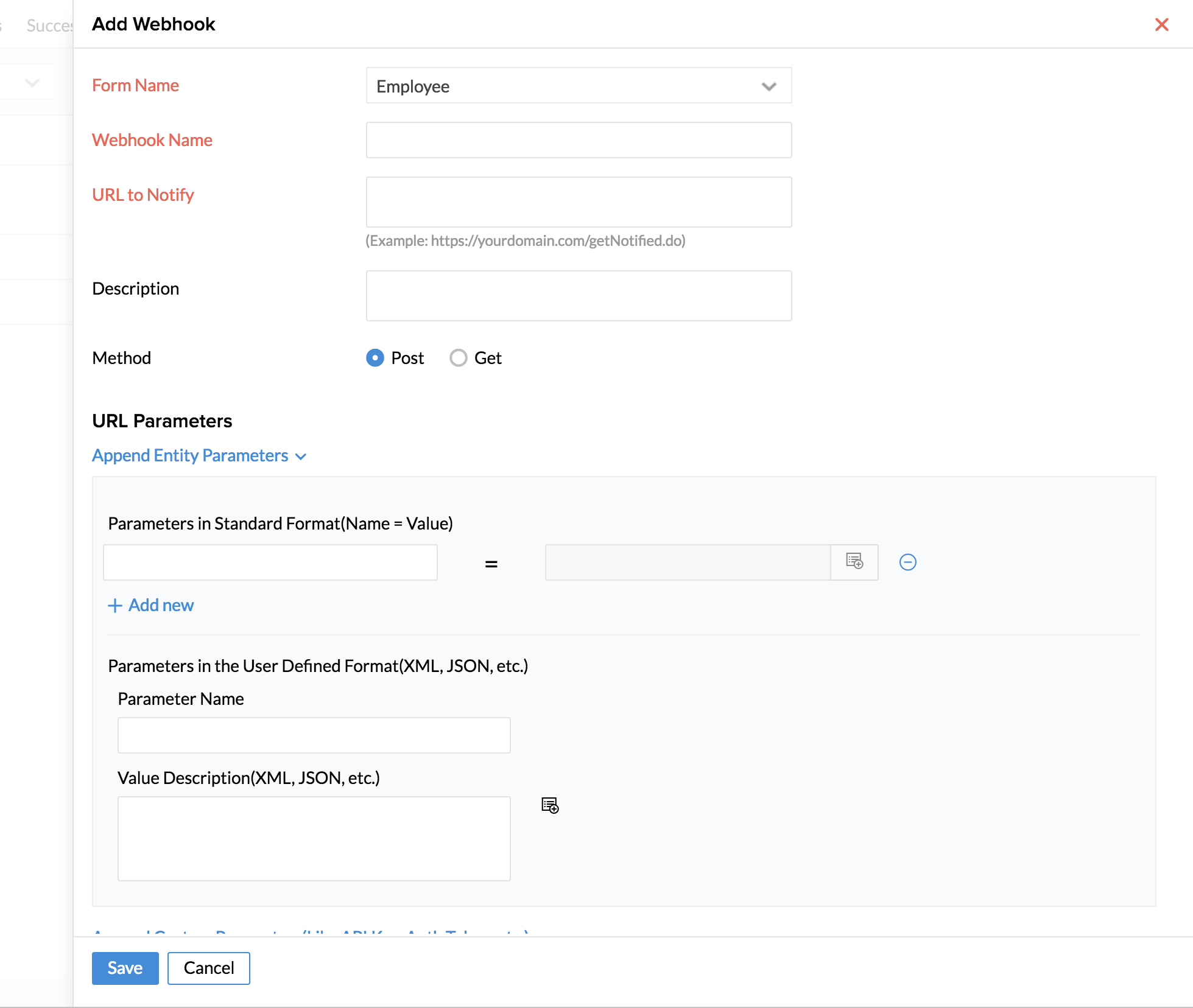 | Append Custom Parameters | Specify the Zoho People Parameter Name and corresponding Value for the webhook. This is also the request parameters sent while triggering the webhook. The name and the value are as configured. This key/value pair is mainly used to send the Auth tokens, security tokens, etc. | String | - |