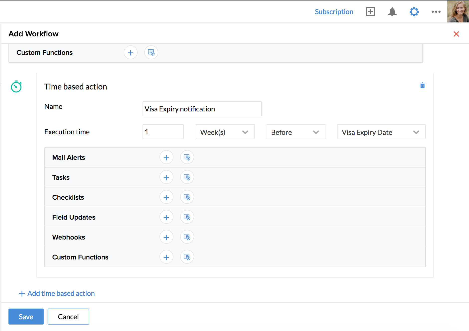 - Time-Based Action - It helps to execute the Workflow when given a specific execution time. Alerts, tasks and updates using Webhooks will be scheduled and triggered based on a specified time.
