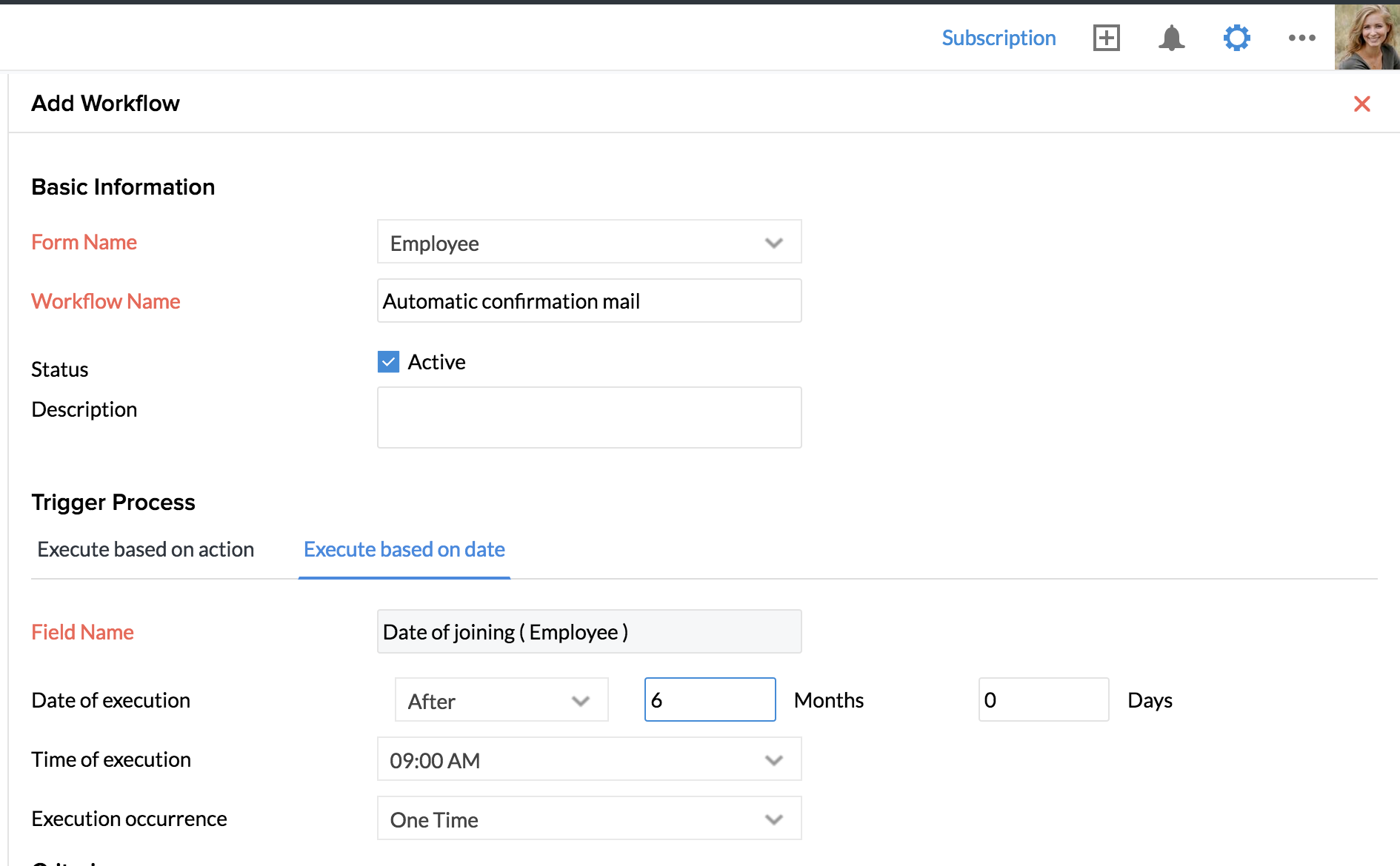 Now a workflow has been created. After completion of six months from the Date of Joining, an email will be sent to employees with the Confirmation Letter as the attachment.