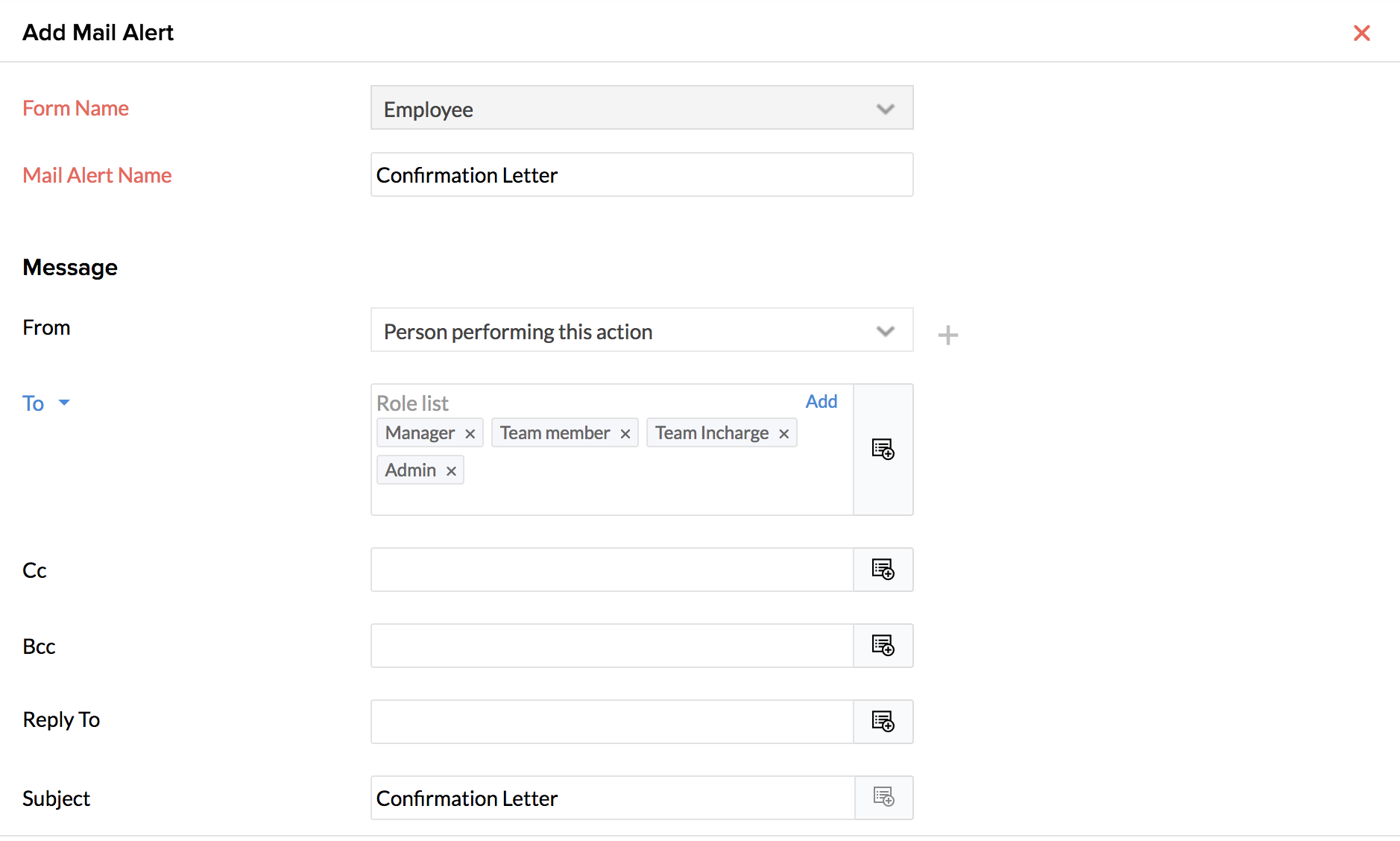 Tip : Click here to know more about creating Record templates and here to know about Mail Merge templates - Give a name for the mail alert - for Eg- Confirmation of Employees