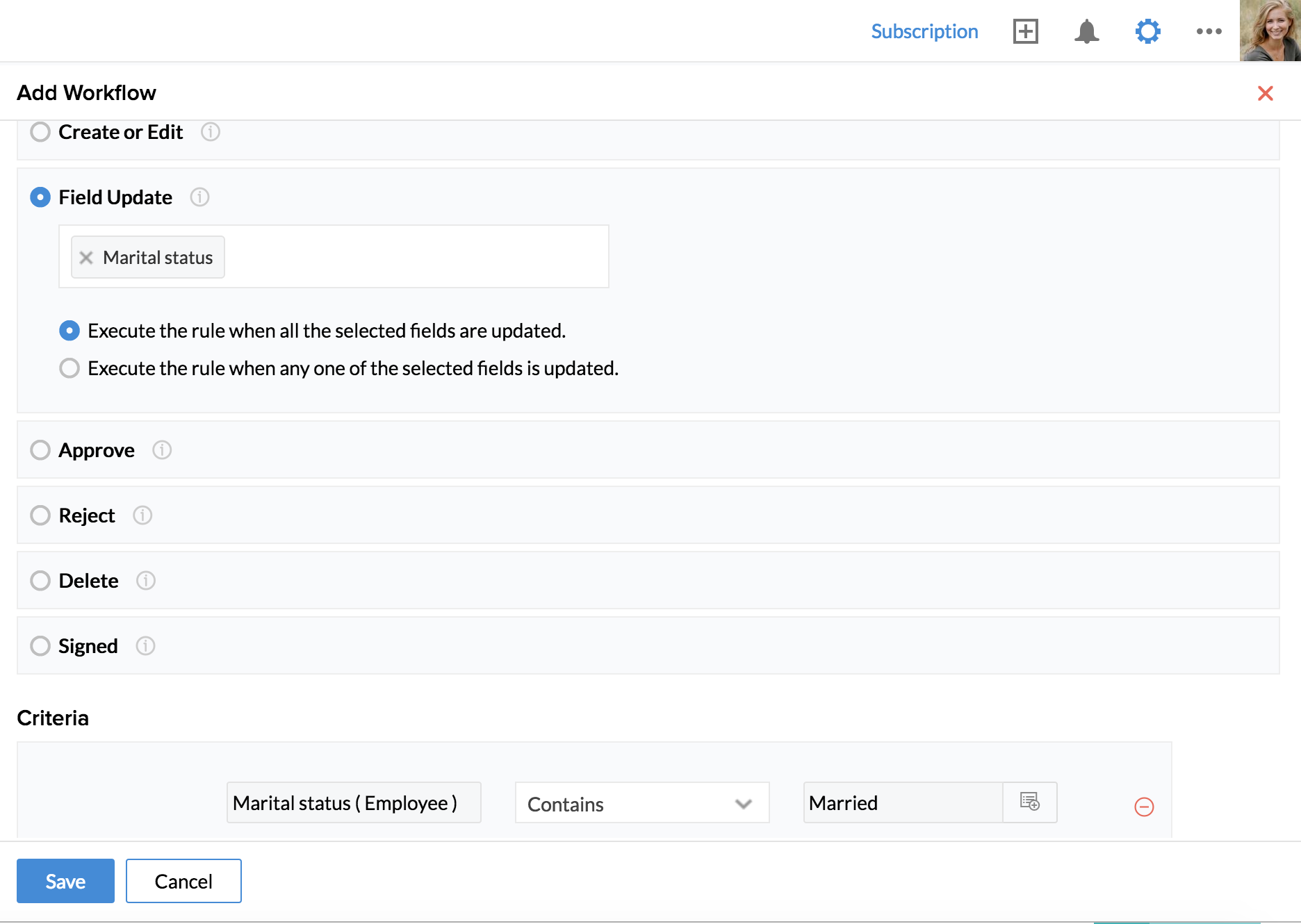 Let's consider this scenario: As soon as an employee changes the Marital status as Married in the employee form, you can have an email sent automatically to wish him/her. A workflow can be configured for this purpose.