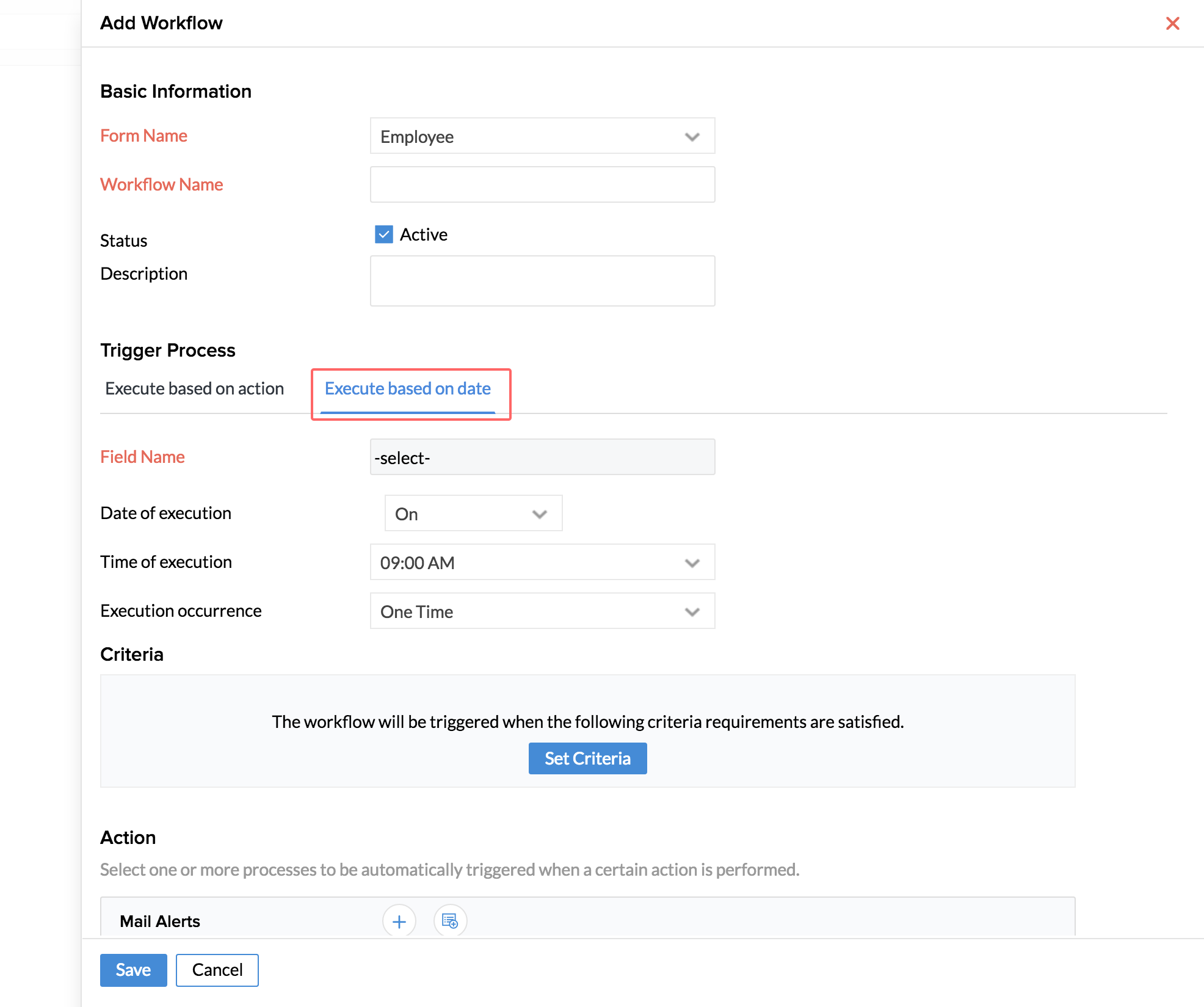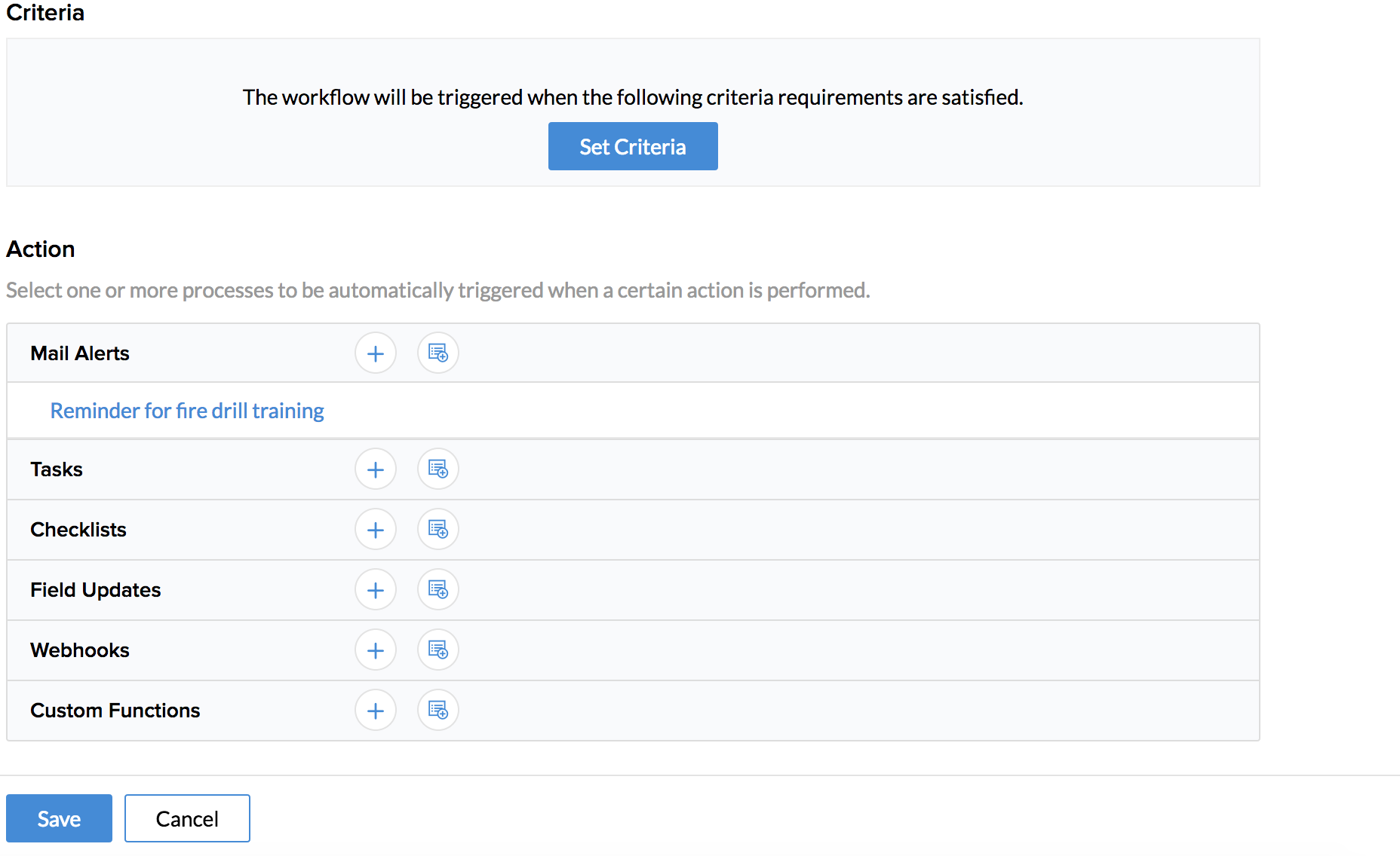 - Trigger Process - It helps to trigger the Workflow based on the Criteria and Execute based on Action such as Create, Edit, Create or Edit, Field Update, Approve, Reject, Delete and Execute based on Date. The whole process is executed through actions such as Mail Alerts, Checklist, Webhook list, and Custom Functions.
