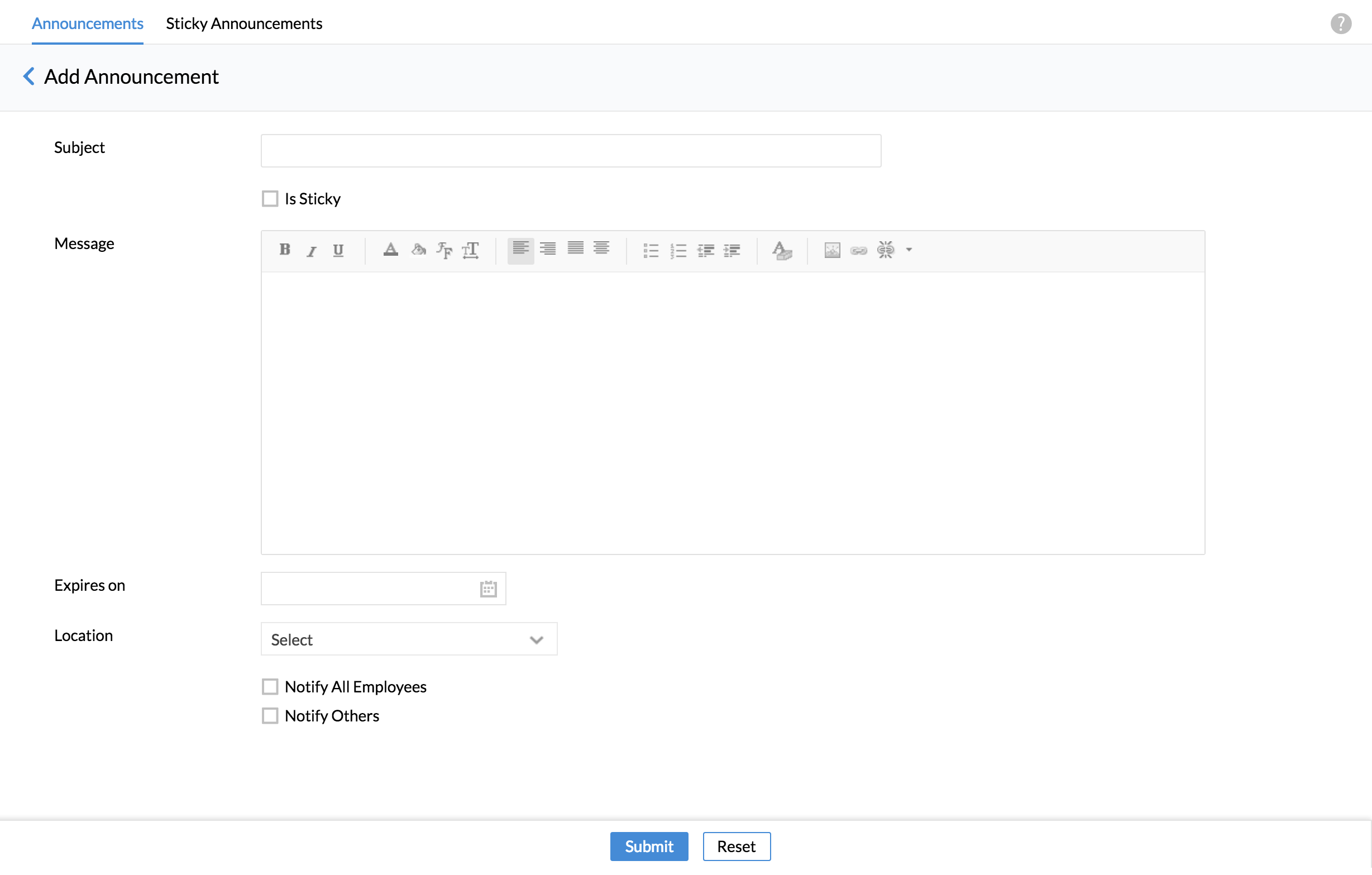 - Select Notify all Employees if this announcement should be viewed by everyone in the location(s) specified