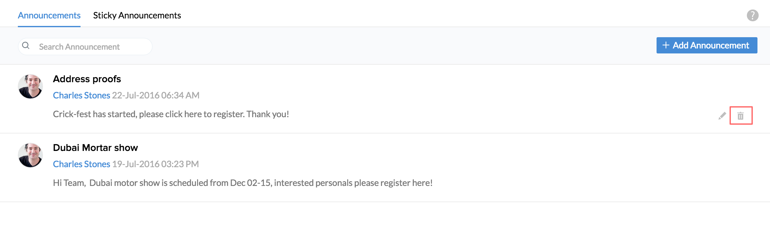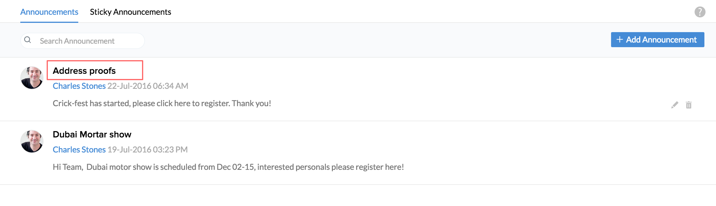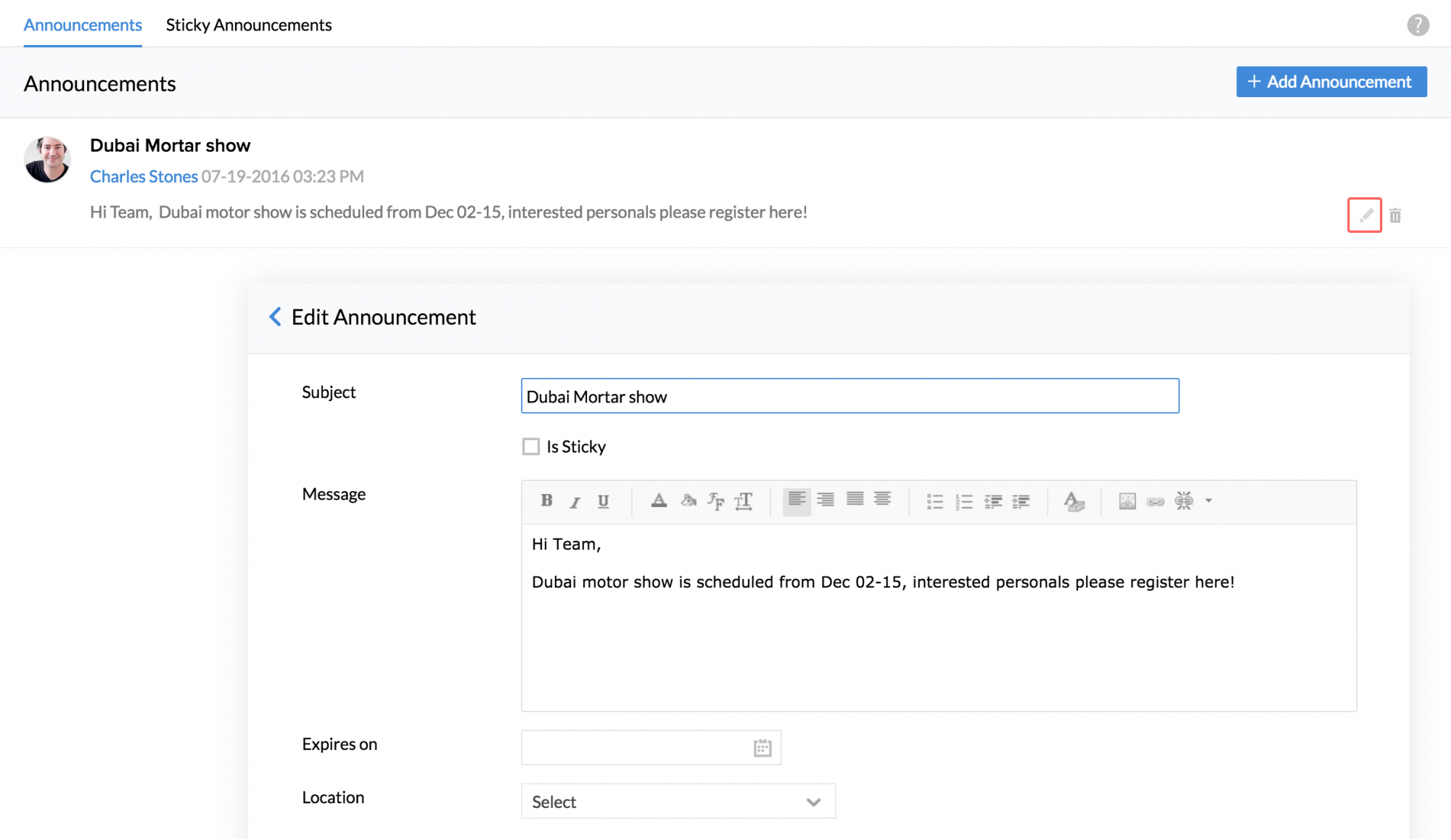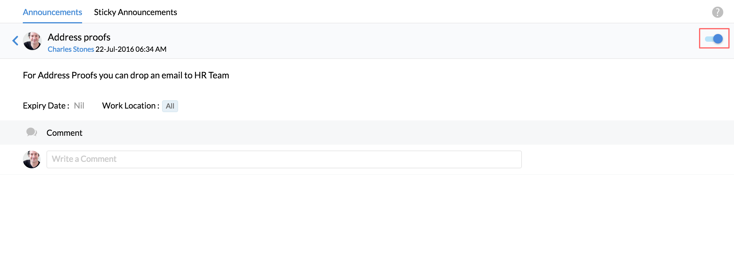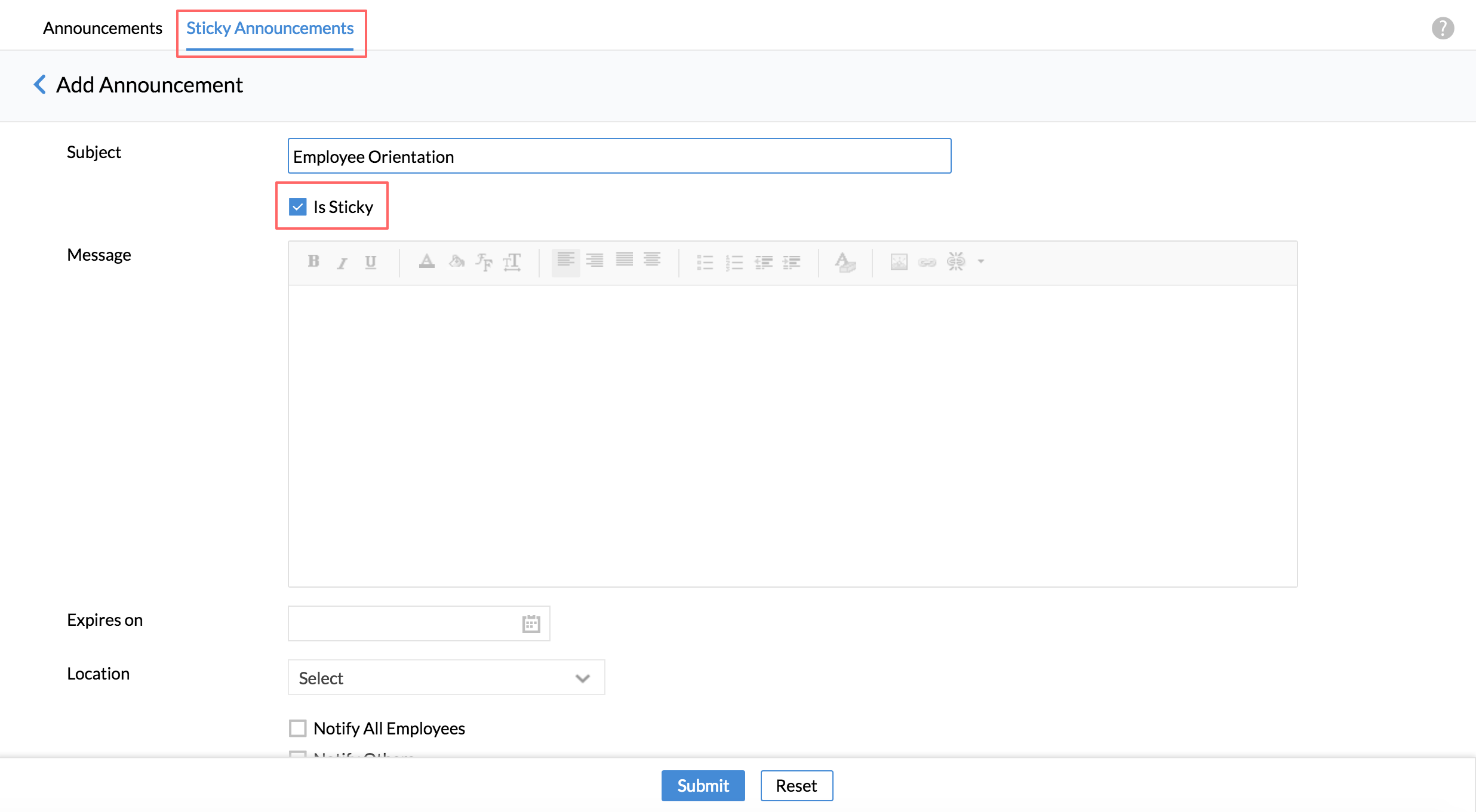 Sticky announcements are those announcements that should always be available for the view of employees. In the Announcement tab, as and when new announcements are posted, the old ones are pushed down. However, if an announcement is created as a Sticky announcement, then it will always be available under the Sticky Announcement tab for employees to view it.