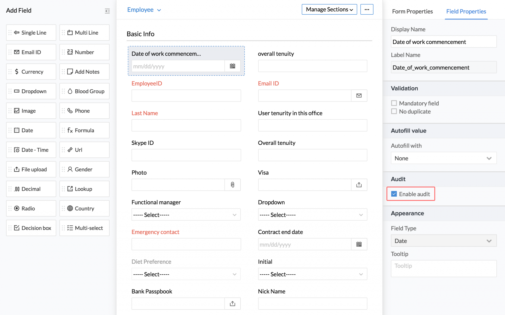 To be able to view audit history, you should have first enabled audit history for the particular field in the form. Follow the steps given below to do this.