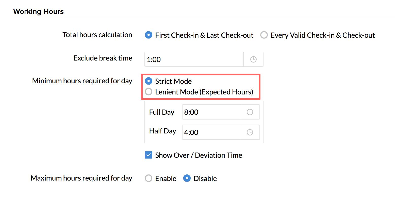- Lenient Mode: Lenient Mode is for organizations that have flexible work hours. Let us assume that you have set 9 hours as working hours for your organization. In the lenient mode, if an employee checks in on a particular day, it means that the employee is present for the day.