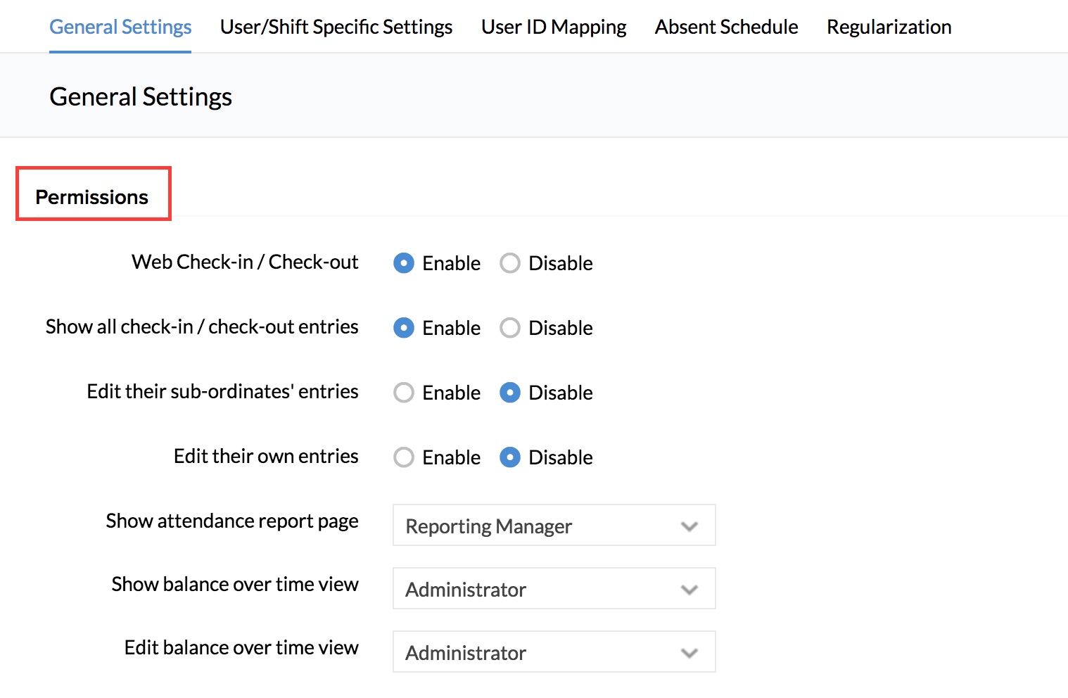 Under Permissions, you can define permissions to enable employees from doing a web Check-in/Check out. You can also handle attendance regularization under Permissions.
