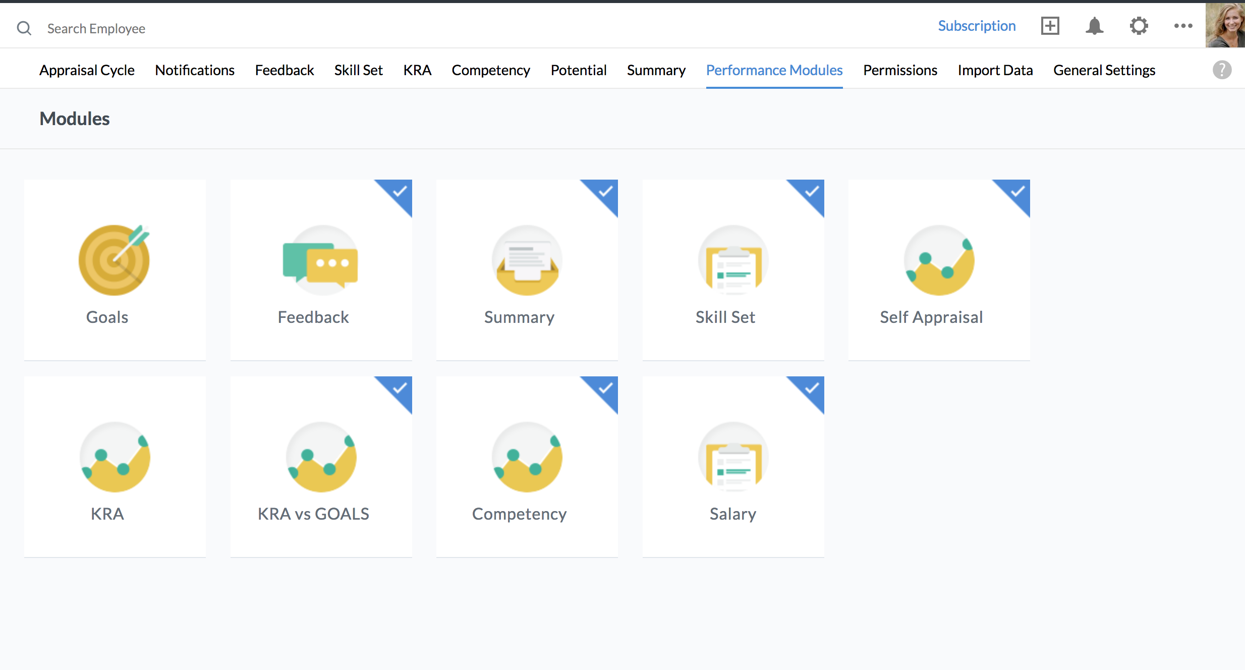 You can make use of the modules listed below to evaluate your employee's performance.